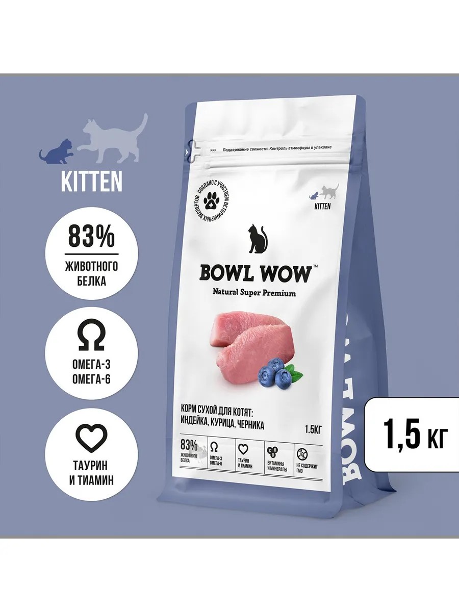 BOWL WOW Сухой корм для котят, с курицей и черникой 1,5кг