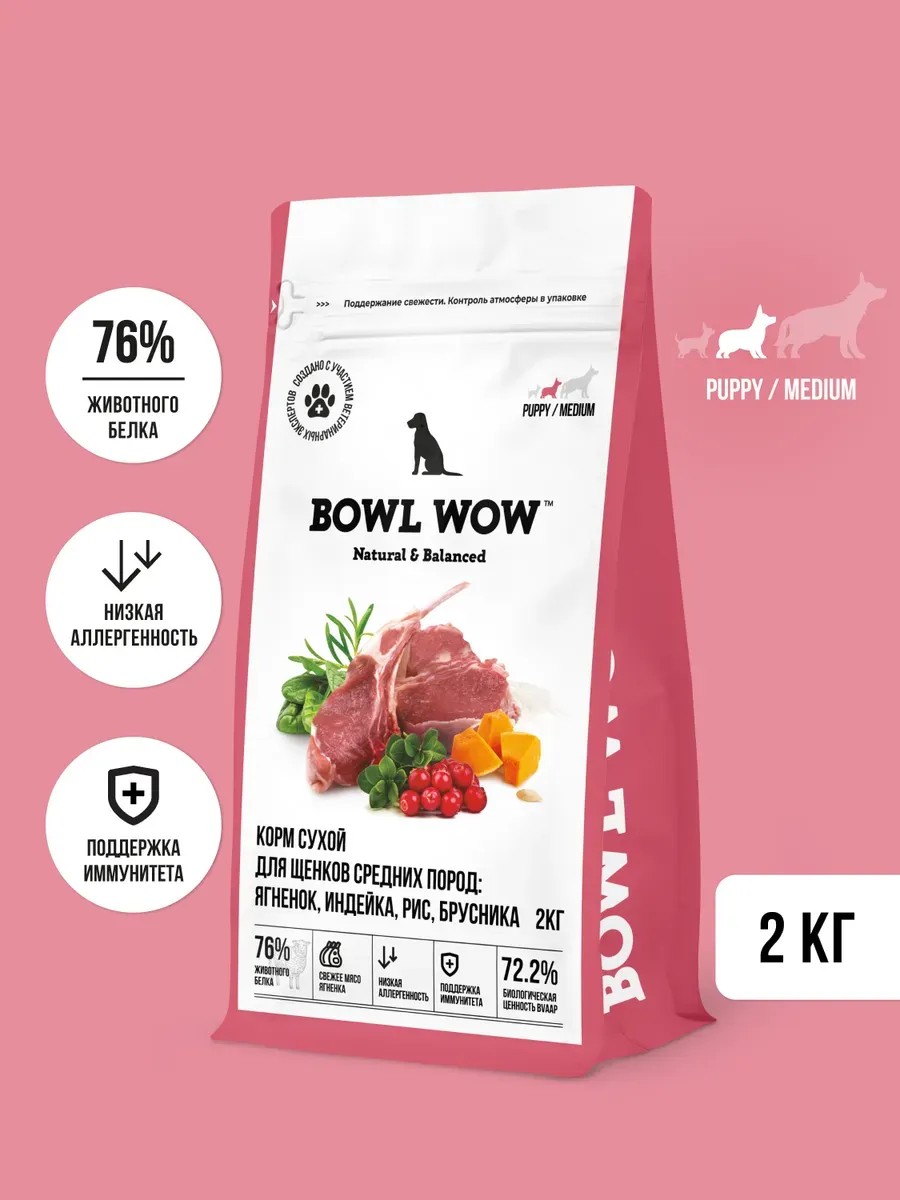 BOWL WOW Сухой корм для средних щенков индейка, ягненок, рис - 2 кг