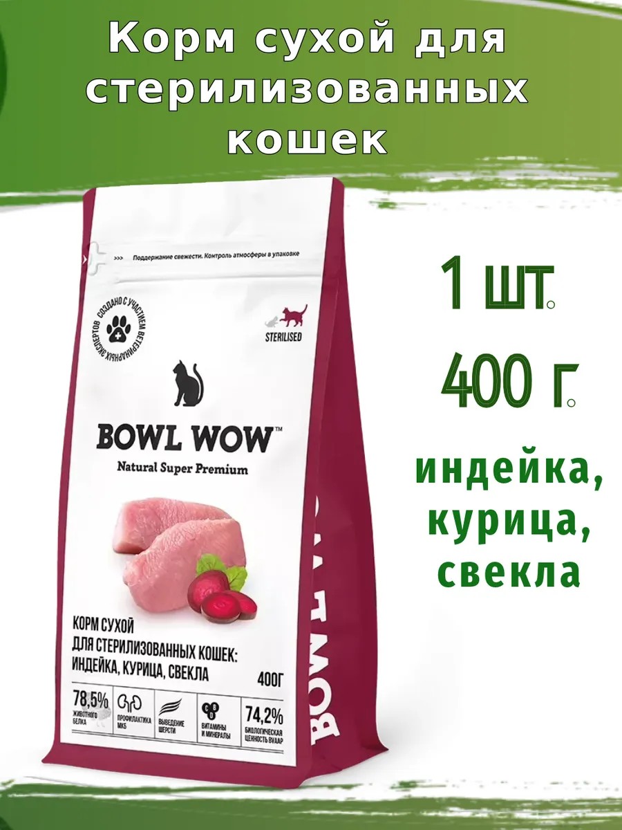 BOWL WOW Корм для стерилизованныхкошек с индейкойисвеклой 400г