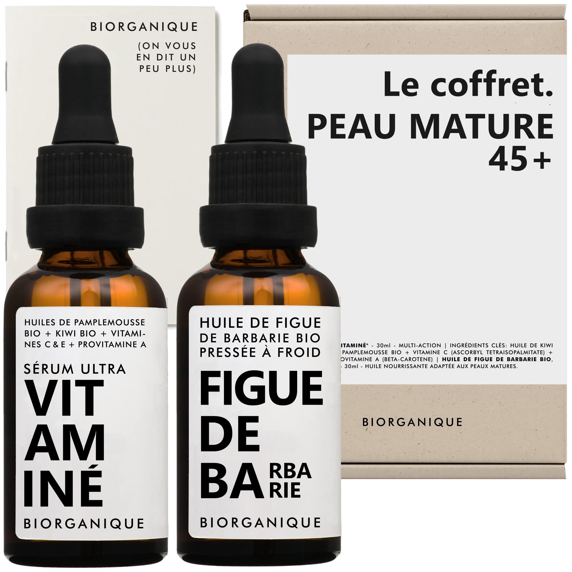 APPLICATION INSTRUCTIONS Since the serum and oil are rich, 2 to 3 drops are enough. Apply the oil and serum in the evening, first the oil and then the serum. Always apply last in your beauty routine (If you use a cream or hydrosol, apply them before). ORGANIC PRICKLY PEAR OIL 100 Natural ORGANIC 100 100 YUKA Care oil perfectly suited to mature skin. Nourishes, protects the skin helps reduce wrinkles and fine lines. ORGANIC Prickly Pear Oil is the most Exclusive and Precious oil that can exist. It is a rare and exceptional oil. ULTRA VITAMIN SERUM 100 Natural 100 100 YUKA Multi-benefit action Nourishes Healthy glow and anti-fatigue effect Protects against external aggressions Anti-wrinkles and fine lines Boosts cell regeneration Maintains skin elasticity Soothes Only 8 essential ingredients including a botanical blend of 5 organic oils. SPECIFICITIES Box set consisting of 1x Organic Prickly Pear oil 30ml 1x Multi-Action "Ultra vitaminized" serum with vitamins C, E and provitamin A 30ml. Made in FRANCE. In AMBER GLASS bottles, for optimal protection and with a glass PIPETTE for quick and precise application.MODE D'APPLICATION Le sérum et l'huile étant riches, 2 à 3 gouttes suffisent. Appliquez l'huile et le sérum le soir, d'abord l'huile et ensuite le sérum. Toujours appliquer en dernier dans la routine beauté (Si vous utilisez une crème ou hydrolat, appliquez les avant). HUILE DE FIGUE DE BARBARIE BIO 100 Naturelle BIO 100 100 YUKA Huile de soin parfaitement adaptée aux peaux matures. Nourrit, protège la peau aide à réduire les rides et ridules. L'huile de Figue de Barbarie BIO est l'huile la plus Exclusive et Précieuse qu'il puisse exister. Il s'agit d'une huile rare et d'exception. SÉRUM ULTRA VITAMINÉ 100 Naturel 100 100 YUKA Action multi-bénéfice Nourrit Effet bonne mine et anti-fatigue Protège des agressions extérieures Anti rides et ridules Booste la régénération cellulaire Maintien l'élasticité de la peau Apaise 8 ingrédients essentiels seulement dont un assemblage botanique de 5 huiles BIO. SPÉCIFICITÉS Coffret composé de 1x huile de Figue de Barbarie BIO 30ml 1x sérum Multi-Action « Ultra vitaminé » aux vitamines C,E et provitamine A 30ml. Fabriqué en FRANCE. Dans des flacons en VERRE AMBRÉ, pour une protection optimale et avec une PIPETTE en verre pour une application rapide et précise.