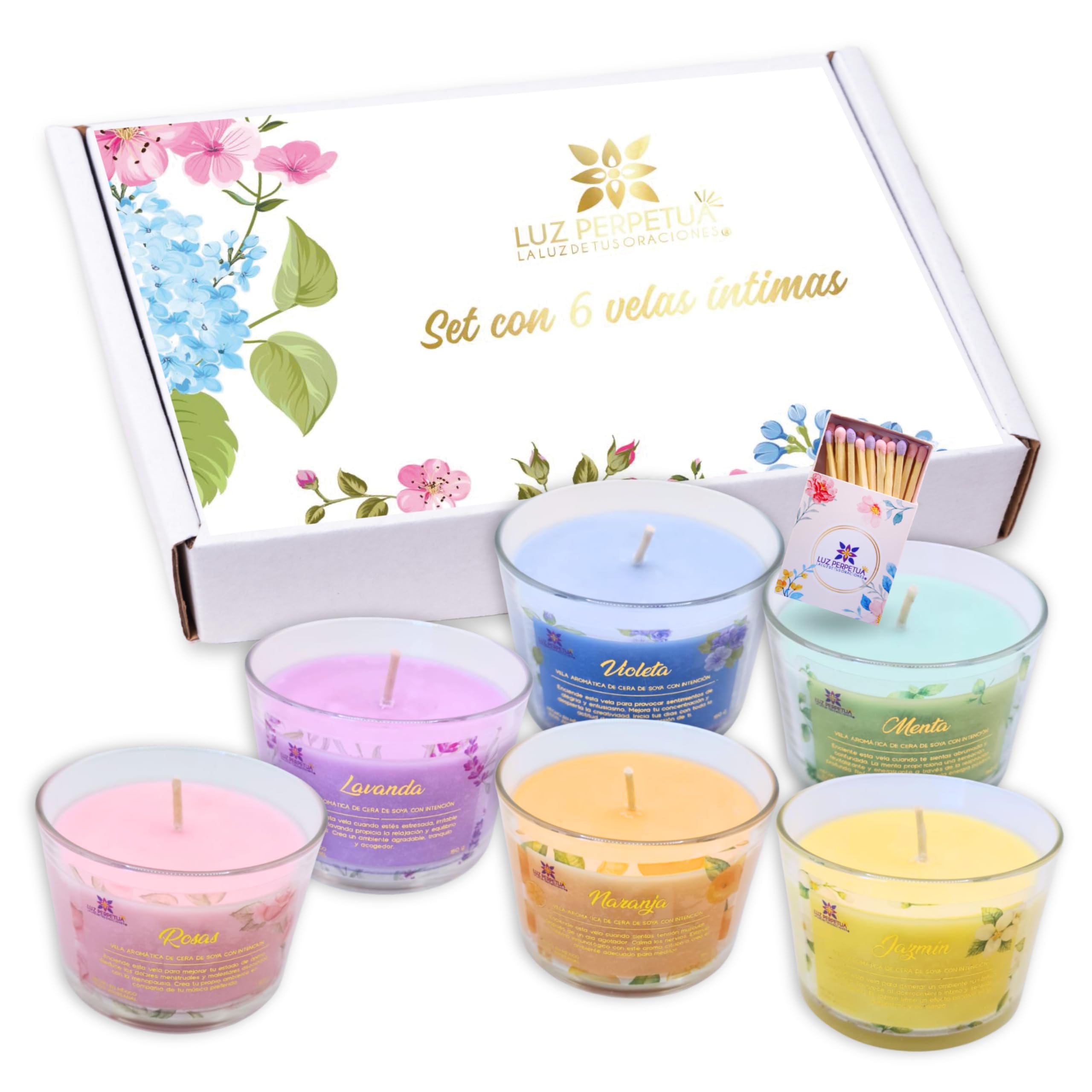 6 Pack Scented Candles. Scented candles gift set includes 6 classic fragrances: Lavender, Roses, Mint, Violet, Orange and Jasmine. Premium set of aromatic candles with intention for every moment of the day. Handmade candles with 150 grs. 100% natural soy wax. Without toxic additives. Container in reusable transparent glass cups measuring 6cm high x 8cm in diameter. The INTIMATE SET weighs a total of 2 Kg. The box with scented candles has an elegant finish with heat-shrinkable plastic that enhances the beauty and luxury of this set. We emphasize that they are 100% handmade candles made in Mexico, not Chinese like others. Natural Fragance with our aromatherapy candles use natural plant-derived fragrance, there will be no irritating smell, lit with a light plant fragrance. The scented candle set has high quality fragrances that remain in the environment, even when turned off. The 6 aromatherapy candles with their metal letters (foil) have a high melting point that includes a dust holder for each candle glass and a box with matches. The natural floral aroma of the intimate scented candle set is a great gift for a special person. The decorative candle set with its floral design and beautiful packaging is also ideal for giving as a gift on Mother's Day, Women's Day, Valentine's Day, Christmas, Birthdays, Anniversaries, etc.