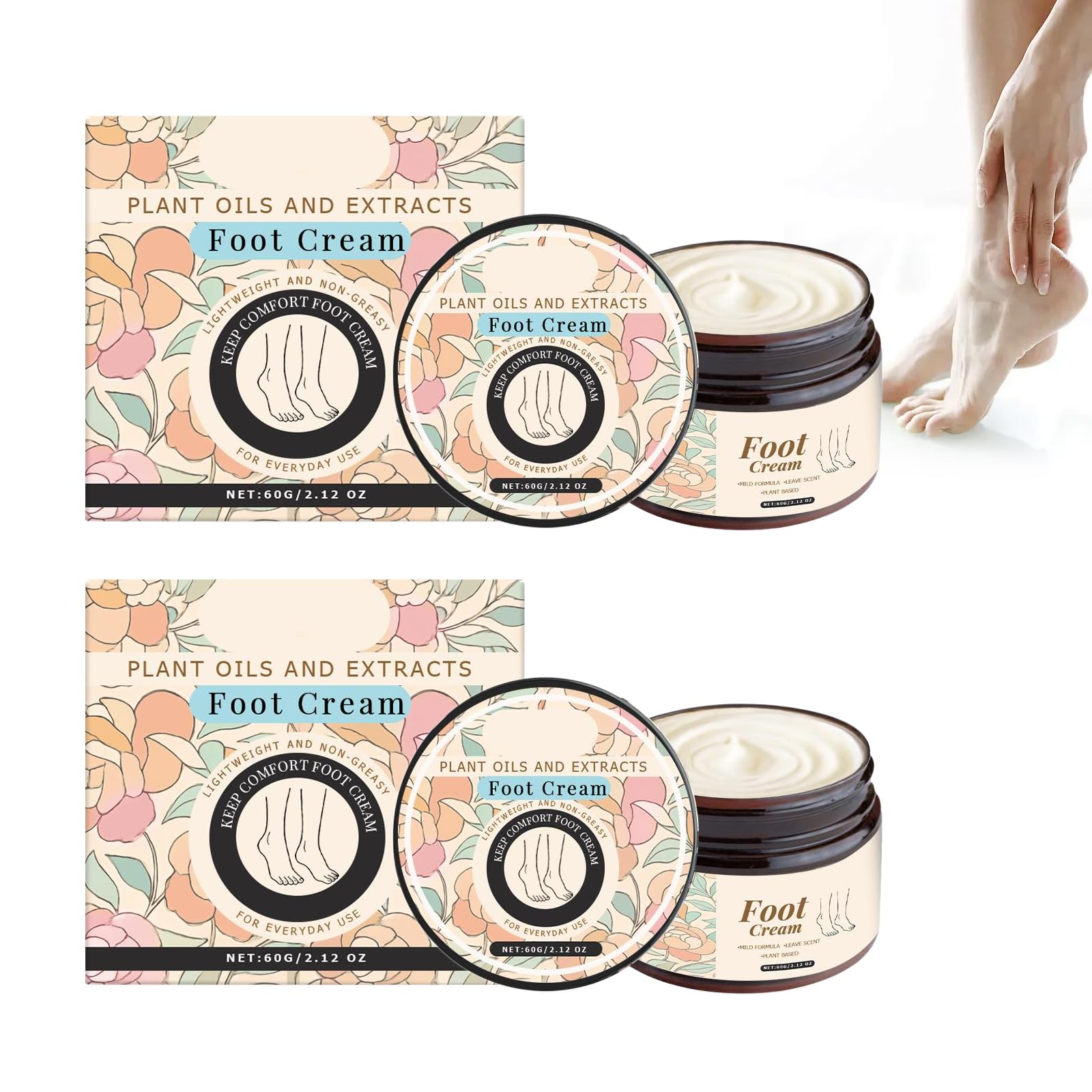 Foot cream, cooling and soothing for feet, supports pain and stiffness in tired feet, foot care, hydration, repair for dry cracked feet for cracked heels, gently repairs and peels foot cream for women and men SAFETY WARNINGEasy application for daily care: ideal for the evening care routine to pamper the feet after a long day and intensively regenerate the skin overnight. Support skin elasticity: Regular use can make the skin of the feet appear stronger and more supple, contributing to a better-groomed appearance. Fast-absorbing, non-greasy texture: The light texture is quickly absorbed without leaving a sticky residue, so feet can be pushed straight into socks or shoes. Soothing care for stressed feet: the cream gently cares for the skin and can help reduce rough spots on heels and soles of the feet, for a pleasant and cared-for feeling after each application. Intensive hydration for dry feet: the rich formula intensively hydrates rough and stressed skin on the feet to relieve feelings of tension and make the skin noticeably softer.Voetcrème, 2 stuks, verzorging en vocht voor gescheurde en droge voeten, trekt snel in voor een soepele zachte huid, ideaal voor dagelijks gebruik 's avonds of na het douchen Voetcrème, verkoelend en kalmerend voor voeten, ondersteunt pijn en stijfheid bij vermoeide voeten, voetverzorging, hydratatie, reparatie voor droge gescheurde voeten voor gebarsten hielen, repareert zacht en peelt voetcrème voor vrouwen en mannen VEILIGHEIDSWAARSCHUWINGEenvoudige toepassing voor dagelijkse verzorging: ideaal voor de avondverzorgingsroutine om de voeten na een lange dag te verwennen en de huid 's nachts intensief te regenereren. Ondersteuning van de huidelasticiteit: door regelmatig gebruik kan de huid van de voeten sterker en soepeler lijken, wat bijdraagt aan een beter verzorgd uiterlijk. Snel intrekkende, niet-vette textuur: de lichte textuur trekt snel in zonder kleverige resten achter te laten, zodat de voeten direct in sokken of schoenen kunnen worden geduwd. Kalmerende verzorging voor belaste voeten: de crème verzorgt de huid zacht en kan ruwe plekken op hielen en voetzolen helpen verminderen, voor een aangenaam en verzorgd gevoel na elk aanbrengen. Intensieve hydratatie voor droge voeten: de rijke formule hydrateert ruwe en belaste huid aan de voeten intensief om spanningsgevoelens te verlichten en de huid merkbaar zachter te maken.