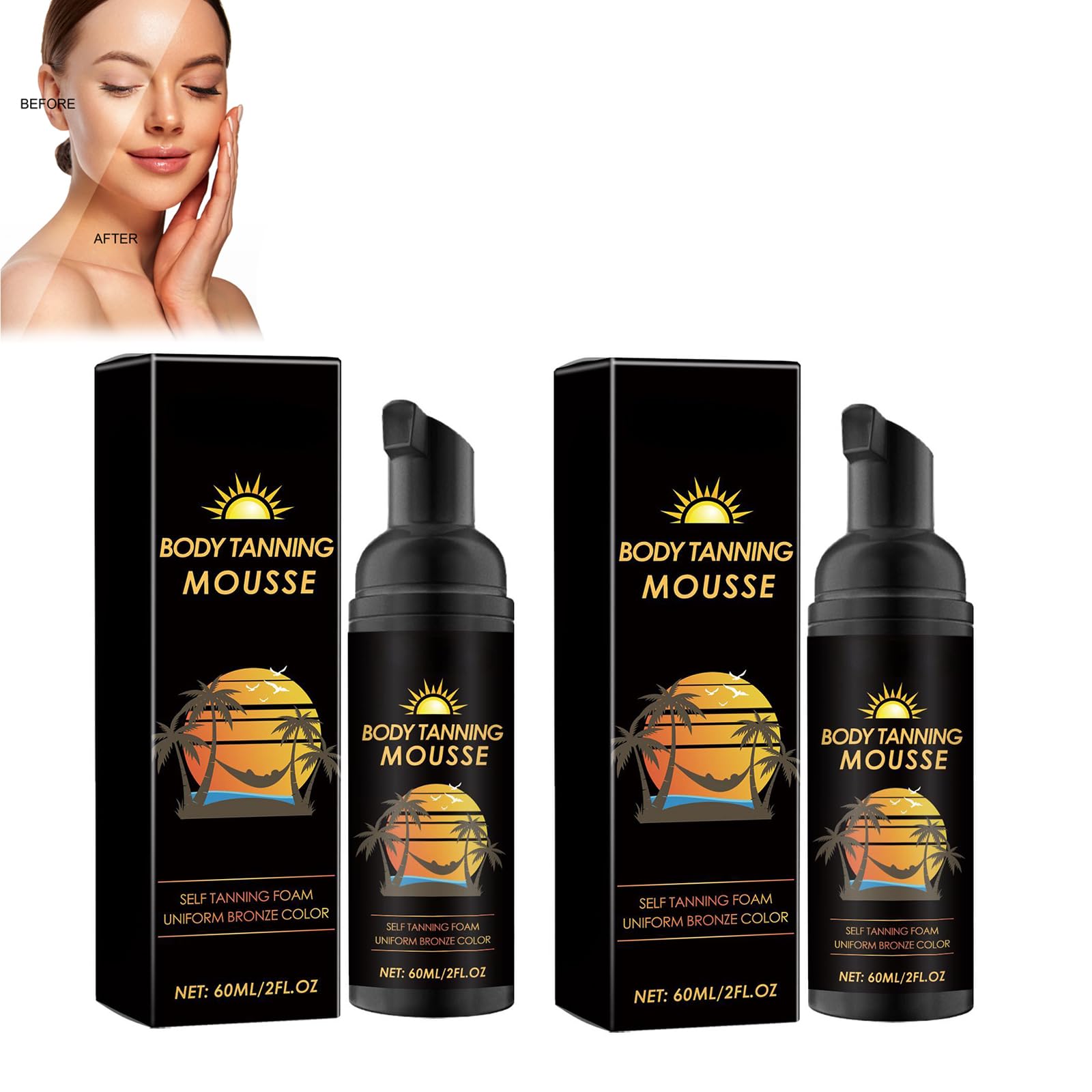 Instant adhesion with natural finish: the 2 pieces 60 ml self-tanning mousse provides an immediate, streak-free tan for body and face. Achieve a sun-kissed glow in just a few hours with a natural-looking tan that deepens over time to give you a flawless, radiant finish. EASY TO USE: The light mousse formula is easy to apply and quickly absorbed into the skin to achieve an even tan. Simply use a tanning glove to apply the product in circular motions to ensure even, mess-free coverage. Long-lasting results: this self-tanner provides multi-day tanning, so you can enjoy your radiant skin for longer. The formula is designed to fade evenly and leave your skin with a beautiful, sun-kissed glow, without spots or streaks. Suitable for all skin types: whether you have light, medium or dark skin, this self-tanning mousse is suitable for all skin types. Thanks to the buildable formula, you can determine the depth of your tan yourself and thus get the perfect color for your complexion. Comfortable travel size: each bottle contains 60 ml, making it perfect for traveling or on the go. With two bottles you have enough to maintain your tan for multiple applications and ensure that you stay tan and radiant wherever you are. INSTRUCTIONS FOR USE Apply the mousse with a tanning glove in circular movements. Allow the product to develop for the recommended time and rinse out any excess after a certain amount of time. SAFETY WARNING Keep Away from Kids Keep the container tightly closed in a dry and well-ventilated place. See moreComfortable travel size: each bottle contains 60 ml, making it perfect for traveling or on the go. With two bottles you have enough to maintain your tan for multiple applications and ensure that you stay tan and radiant wherever you are. Suitable for all skin types: whether you have light, medium or dark skin, this self-tanning mousse is suitable for all skin types. Thanks to the buildable formula, you can determine the depth of your tan yourself and thus get the perfect color for your complexion. Long-lasting results: this self-tanner provides multi-day tanning, so you can enjoy your radiant skin for longer. The formula is designed to fade evenly and leave your skin with a beautiful, sun-kissed glow, without spots or streaks. EASY TO USE: The light mousse formula is easy to apply and quickly absorbed into the skin to achieve an even tan. Simply use a tanning glove to apply the product in circular motions to ensure even, mess-free coverage. Instant adhesion with natural finish: the 2 pieces 60 ml self-tanning mousse provides an immediate, streak-free tan for body and face. Achieve a sun-kissed glow in just a few hours with a natural-looking tan that deepens over time to give you a flawless, radiant finish.Self Tanning Mousse, zelfbruinende mousse, langhoudende zelfbruinende mousse, bronzer, natuurlijke bruining, zonder vlekken voor lichaam en gezicht Onmiddellijke hechting met natuurlijke afwerking: de 2 stuks 60 ml zelfbruiningsmousse zorgt voor een onmiddellijke, streepvrije bruine tint voor lichaam en gezicht. Bereik in slechts enkele uren een zongekuste glans met een natuurlijk uitziende bruine teint die zich in de loop van de ontwikkeling verdiept en je een onberispelijke, stralende afwerking geeft. EENVOUDIG GEBRUIK: De lichte mousse-formule is gemakkelijk aan te brengen en trekt snel in de huid om een gelijkmatige bruining te bereiken. Gebruik gewoon een bruiningshandschoen om het product in cirkelvormige bewegingen aan te brengen en zo een gelijkmatige afdekking zonder rommel te garanderen. Langdurige resultaten: deze zelfbruiner zorgt voor een meerdaagse bruining, zodat je langer van je stralende huid kunt genieten. De formule is zo ontworpen dat hij gelijkmatig vervaagt en je huid met een mooie, zongekuste glans achterlaat, zonder vlekken of strepen. Geschikt voor alle huidtypes: of je nu een lichte, middelgrote of donkere huid hebt, deze zelfbruinende mousse is geschikt voor alle huidtypes. Dankzij de opbouwbare formule kun je de diepte van je bruine kleur zelf bepalen en krijg je zo de perfecte kleur voor je teint. Comfortabel reisformaat: elke fles bevat 60 ml en is daarmee perfect voor op reis of onderweg. Met twee flessen heb je genoeg om je bruine teint voor meerdere toepassingen te behouden en ervoor te zorgen dat je bruin en stralend blijft, waar je ook bent. GEBRUIKSAANWIJZING Breng de mousse aan met een bruiningshandschoen in cirkelvormige bewegingen. Laat het product voor de aanbevolen tijd ontwikkelen en spoel alle overschotten na een bepaalde tijd uit. VEILIGHEIDSWAARSCHUWING Keep Away from Kids Houd de container goed gesloten op een droge en goed geventileerde plaats. Meer bekijkenComfortabel reisformaat: elke fles bevat 60 ml en is daarmee perfect voor op reis of onderweg. Met twee flessen heb je genoeg om je bruine teint voor meerdere toepassingen te behouden en ervoor te zorgen dat je bruin en stralend blijft, waar je ook bent. Geschikt voor alle huidtypes: of je nu een lichte, middelgrote of donkere huid hebt, deze zelfbruinende mousse is geschikt voor alle huidtypes. Dankzij de opbouwbare formule kun je de diepte van je bruine kleur zelf bepalen en krijg je zo de perfecte kleur voor je teint. Langdurige resultaten: deze zelfbruiner zorgt voor een meerdaagse bruining, zodat je langer van je stralende huid kunt genieten. De formule is zo ontworpen dat hij gelijkmatig vervaagt en je huid met een mooie, zongekuste glans achterlaat, zonder vlekken of strepen. EENVOUDIG GEBRUIK: De lichte mousse-formule is gemakkelijk aan te brengen en trekt snel in de huid om een gelijkmatige bruining te bereiken. Gebruik gewoon een bruiningshandschoen om het product in cirkelvormige bewegingen aan te brengen en zo een gelijkmatige afdekking zonder rommel te garanderen. Onmiddellijke hechting met natuurlijke afwerking: de 2 stuks 60 ml zelfbruiningsmousse zorgt voor een onmiddellijke, streepvrije bruine tint voor lichaam en gezicht. Bereik in slechts enkele uren een zongekuste g