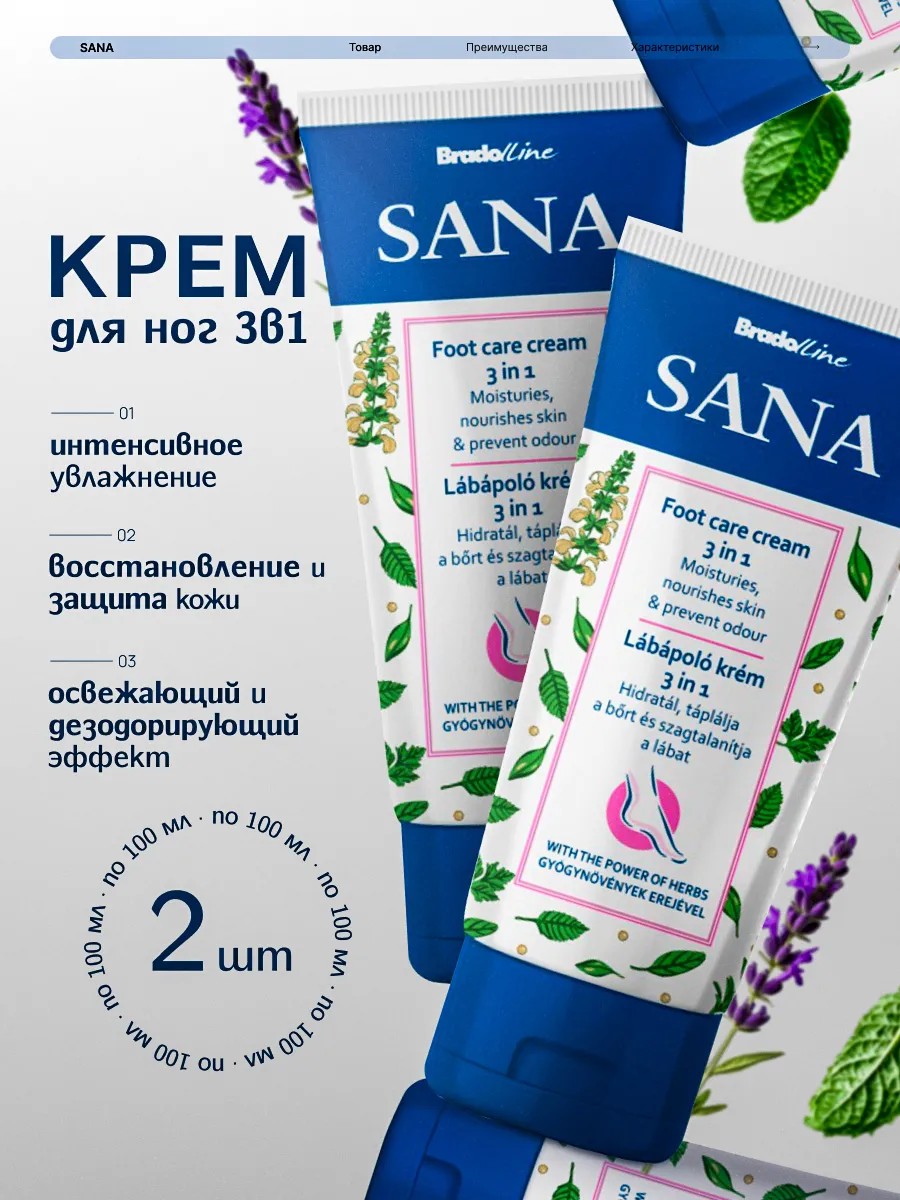 | Полное наименование товара | Sana Крем для ног 3в1, 100 мл. - 2 шт. |