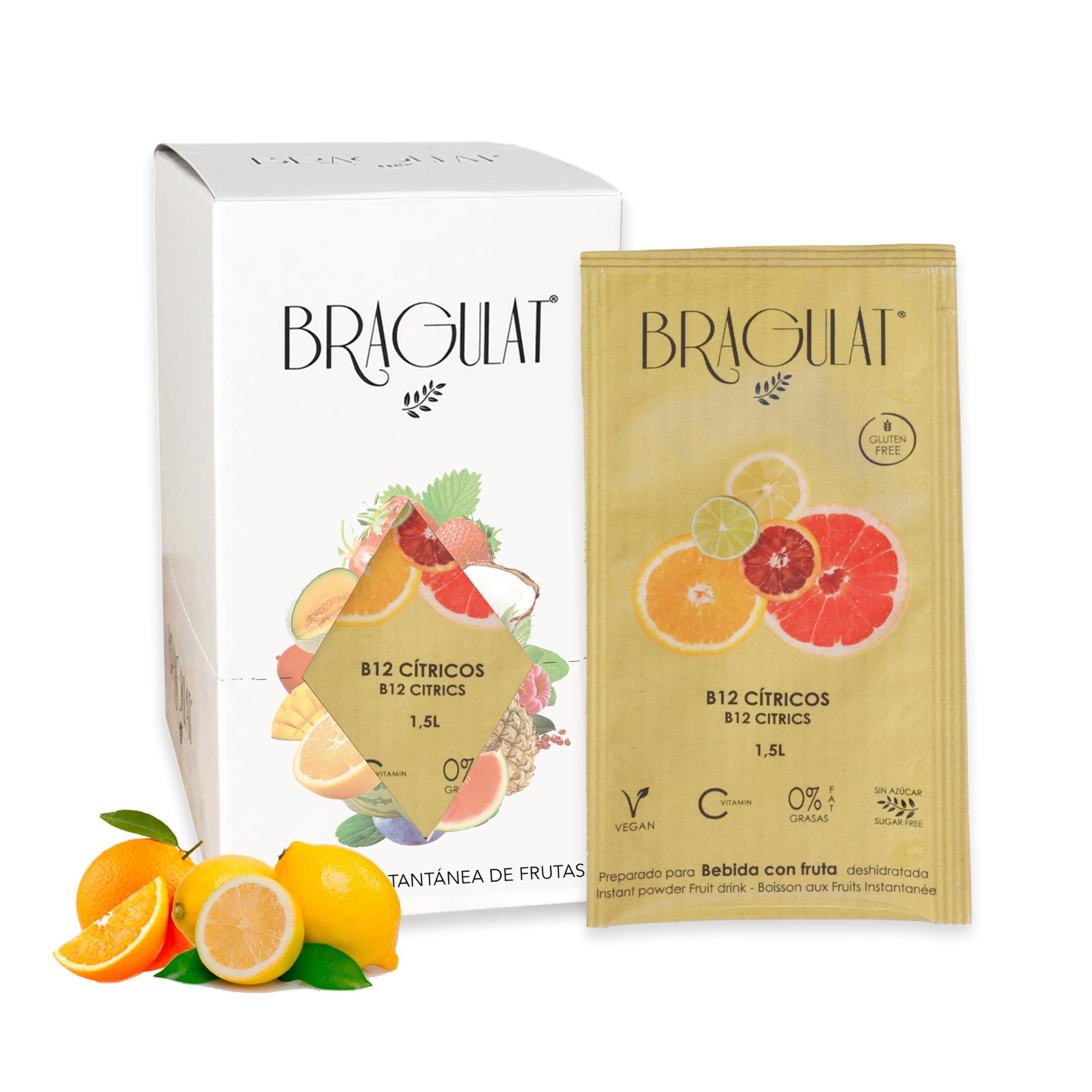 BRAGULAT Boisson avec B12 et Citrics Boissons et rafraîchissements instantanés en poudre Sans sucre et avec de la vitamine C et B12 Eau aromatisée au citron, orange et citron vert 15 Fruit 8 g (Paquete de 1)