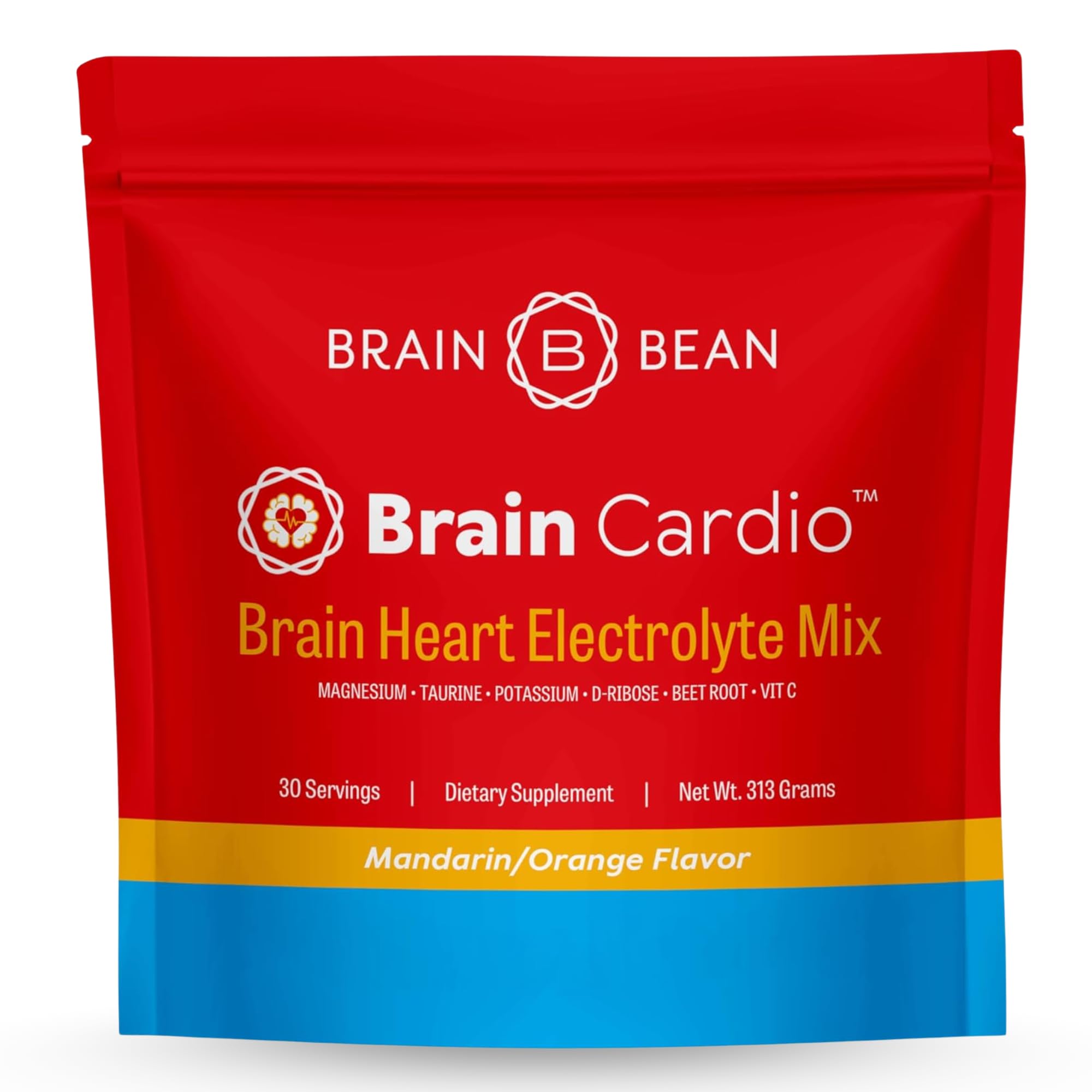 Boost your heart and brain health with Brain Bean's Brain Cardio Electrolyte Mix. This dietary supplement combines magnesium, taurine, potassium, D-ribose, beet root, and vitamin C to support cardiovascular function, mental clarity, and hydration. Enjoy the refreshing mandarin orange flavor with 30 servings per 313-gram pouch—ideal for an active lifestyle or daily wellness routine.