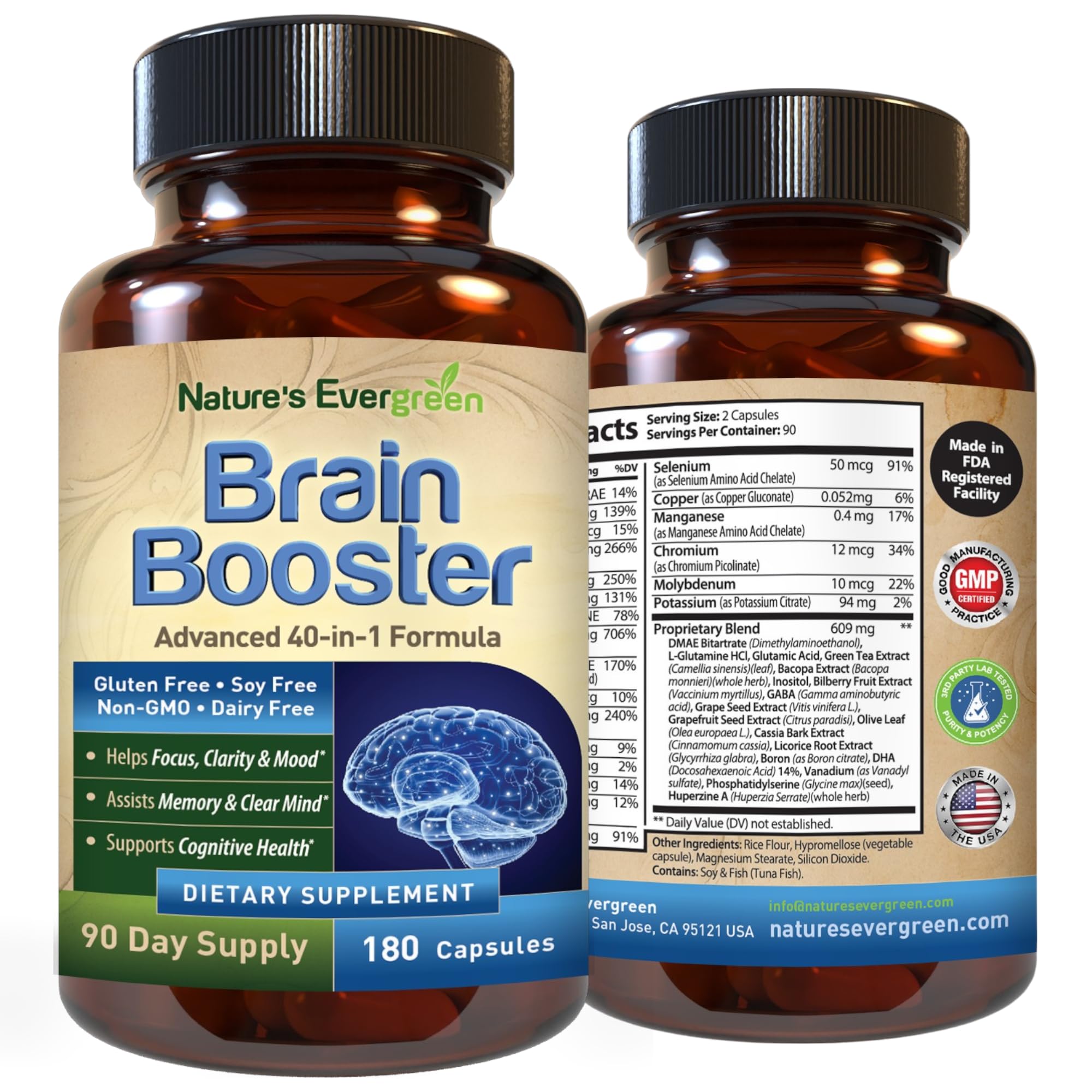 90-DAY MONEY-BACK GUARANTEE: We stand behind every product we make. For any reason, you're not completely satisfied within 90 days, simply reach out to us, and we'll do our best to resolve the issue. Try Nature's Evergreen products with 90-day risk-free guarantee!. PREMIUM QUALITY TRUSTED FORMULA: Proudly made in the USA, non-GMO, gluten free, sugar free and dairy free. This Brain Booster supplement is manufactered in GMP certified facilities in the United States, each batch is third party lab tested to ensure the highest standards of purity potency, and safe ingredients that you can use with confidence. 90 DAY SUPPLY TO SUPPORTS BRAIN HEALTH: Each bottle provides a 90 day supply to ensure optimal freshness and consistent support for brain health. It's formulated to promote healthy neurotransmitter function, as imbalances can affect mood, memory, energy, and sleep. With essential ingredients like Zinc, Magnesium, and a proprietary GABA blend, this supplement helps optimize brain function. Unlock your potential and boost cognitive performance with every dose. MAXIMUM BOOSTS COGNITION AND MEMORY: Our Brain Booster supplement is packed with key vitamins and minerals known to support memory, cognition, and mood, including Vitamin B6, Folate, and Magnesium. It promotes healthy brain function and sharpens mental performance, while Vitamin C boosts immunity and aids energy conversion. Pantothenic Acid supports energy production, and Choline with Magnesium enhances blood flow and oxygen delivery to the brain for optimal focus and clarity. ADVANCED FORMULA TO SUPPORT YOUR FOCUS, CLARITY MEMORY: Our expertly crafted Brain Booster supplement contains 40 powerful ingredients, carefully selected by nutrition professionals to enhance mental clarity, balance, and cognitive function. This advanced nootropic formula is designed to support focus, concentration, and memory, providing essential vitamins and nutrients that promote sharper mental alertness and long-lasting cognitive performance.