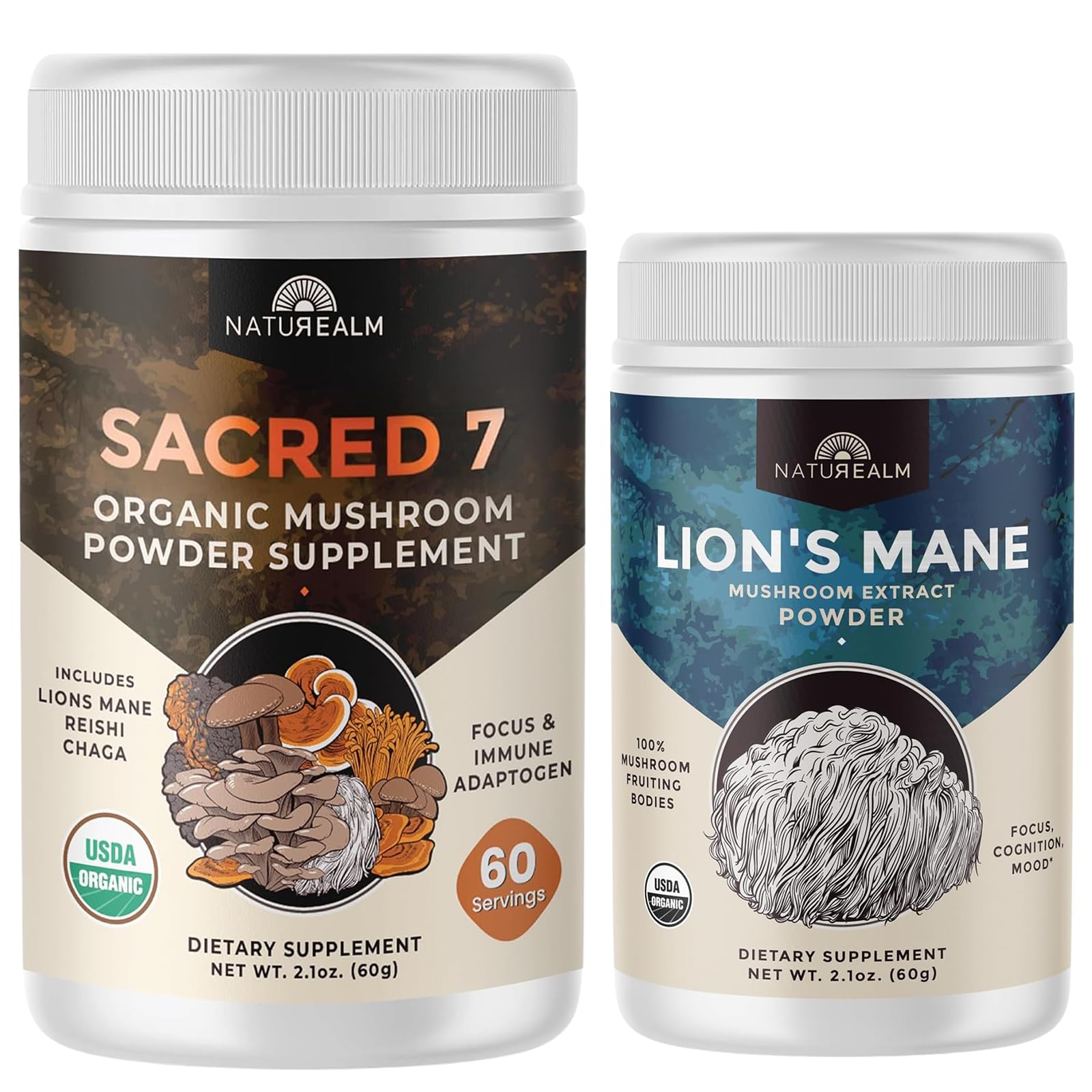 Sacred 7 Naturealm Lion's Mane Mushroom Powder Bundle – Organic, 100 Fruiting Bodies, 60 Servings Each Boost your wellness routine with the Sacred 7 Naturealm Lion's Mane Mushroom Powder Bundle. This organic bundle combines two premium mushroom powders, made from 100 fruiting bodies, to support overall health. Sacred 7 is a blend of seven organic mushrooms—Lion's Mane, Reishi, Chaga, Turkey Tail, Shiitake, Maitake, and Cordyceps—designed to support immunity and mental clarity. It mixes easily into coffee, tea, smoothies, or shakes and is free from mycelium, fillers, and added sugars. Naturealm Lion's Mane is made from 100 organic fruiting bodies to support cognitive function and mental clarity. It's perfect for those seeking natural, non-caffeinated support for focus and memory. Both products are USDA Certified Organic, vegan-friendly, gluten-free, and contain no artificial additives. Each container contains 60 servings, providing a two-month supply. Key Features: Organic mushroom blends for immunity and mental clarity. 100 fruiting body extracts, no fillers or mycelium. Easy to mix into daily beverages. 60 servings per container, lasting two months. Enhance your wellness routine with this natural, clean mushroom bundle.? Mix, Sip Elevate Your Routine Easy to blend into coffee, tea, or smoothies—these mushroom powders dissolve instantly and won't alter taste. Enjoy 60 60 servings of natural nootropic nutrition that fits effortlessly into your daily ritual. 8 Organic Mushrooms for Holistic Wellness From Lion's Mane to Shiitake, Turkey Tail, and Maitake, this bundle delivers a robust lineup of functional mushrooms to support your brain, immune system, and gut—crafted with USDA-certified organic fruiting bodies. ? Smooth, Jitter-Free Energy Adaptogenic Support Sacred 7 features adaptogenic mushrooms like Reishi, Cordyceps, and Chaga that promote clean, sustained energy while helping your body manage stress and stay balanced throughout the day. Lion's Mane for Pure Brain Support Known for its neuroprotective properties, Lion's Mane helps support memory, concentration, and mental agility. This premium powder uses 100 fruiting bodies—no mycelium, no fillers—for maximum cognitive benefits. Dual Nootropic Power for Focus, Clarity Memory Pairing Sacred 7's full-spectrum mushroom blend with pure Lion's Mane extract, this bundle supports sharper focus, cognitive function, and mental clarity—naturally and without caffeine crashes.