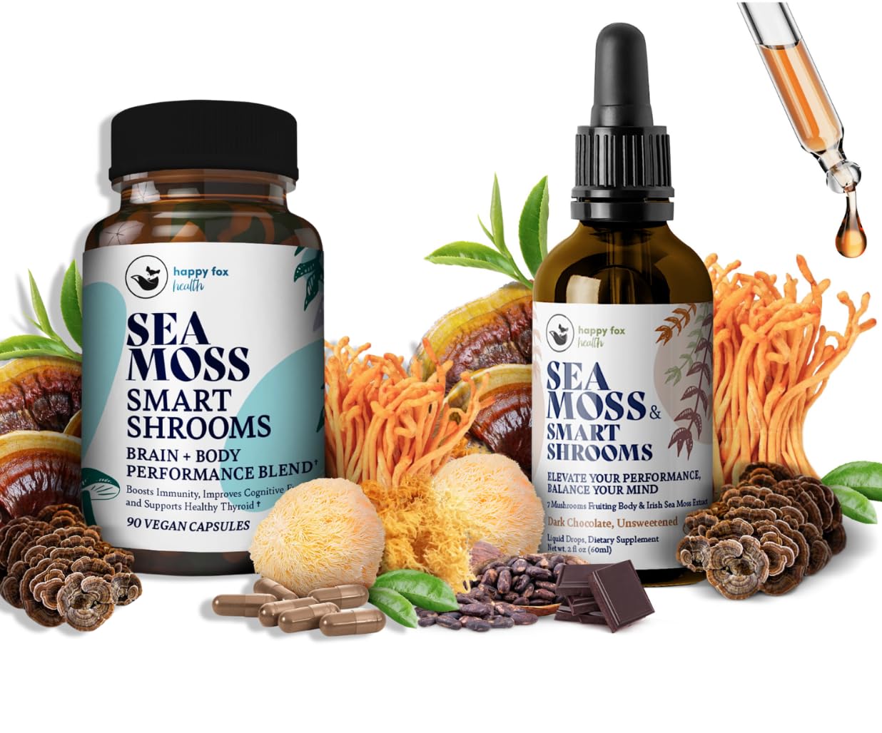 Brain Superfoods Bundle - Organic Sea Moss & Smart Shrooms Capsules and Liquid Drops Bundle Organic Irish Seamoss and 7 Adaptogenic Supplements for Memory and Focus. Liquid Drops in Chocolate Flavor
