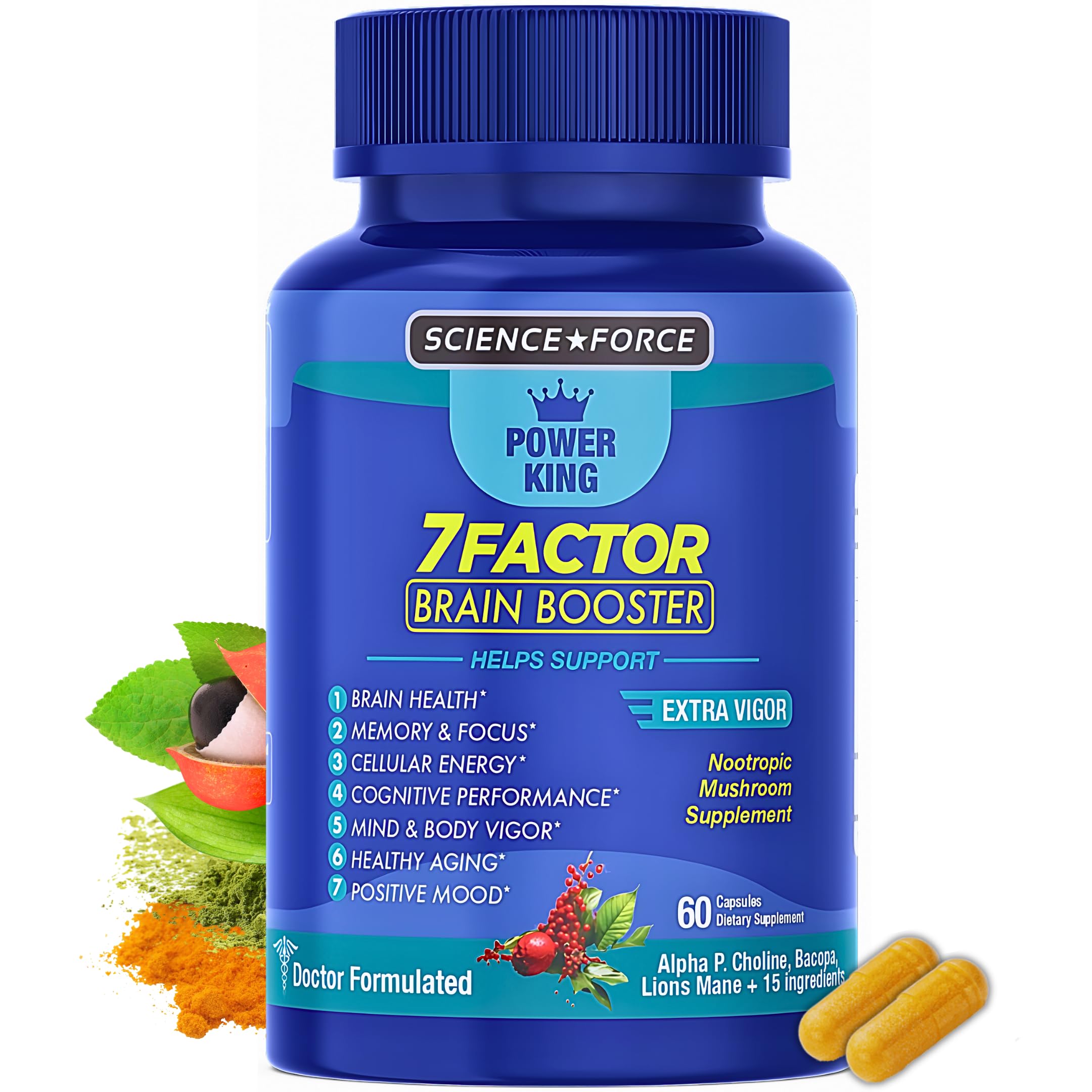 Quality Assured: Manufactured in the USA under strict GMP guidelines for quality and safety. Dosage: Take 2 capsules daily or 1 hour before state of performance for optimal results. Free from artificial colors and synthetics, delivering a clean and natural supplement for your health wellness routine. Key Ingredients: Includes Alpha Phosphatidyl Choline, Bacopa Monnieri, Turmeric, Lions Mane, Ginkgo Biloba, Green Tea, Ashwagandha, Guarana, Maca Root, Damiana, Catuaba, Cordyceps, Shilahit, Mucuna, L-Theanine, L-Arginine, Rhodiola Rosea, Vitamin B3 as Niacin. Experience the pinnacle of Cognitive Enhancement: The Power King 7 Factor Brain Booster is carefully crafted to elevate your mind and body, our formula is designed to propel you to new heights of mental acuity and peak performance. Superior Performance: Boost your confidence levels with Energy Focus Cognitive Enhancement. It allows your full potential experience with Mind Body Extra Vigor for the heavy daily tasks.. Powerful Formula: Our Premium Nootropic Mushroom formula is crafted with 18 high-quality natural ingredients clinically tested to support Mental Clarity and Physical Vitality for a Performance Daily routine. 7 Factor Brain Booster: Elevate your cognitive functions with a powerful supplement designed to support Brain Health, Memory Focus, Cellular Energy, Cognitive Performance, Mind Body Vigor, Healthy Aging and Positive Mood on a daily basis.