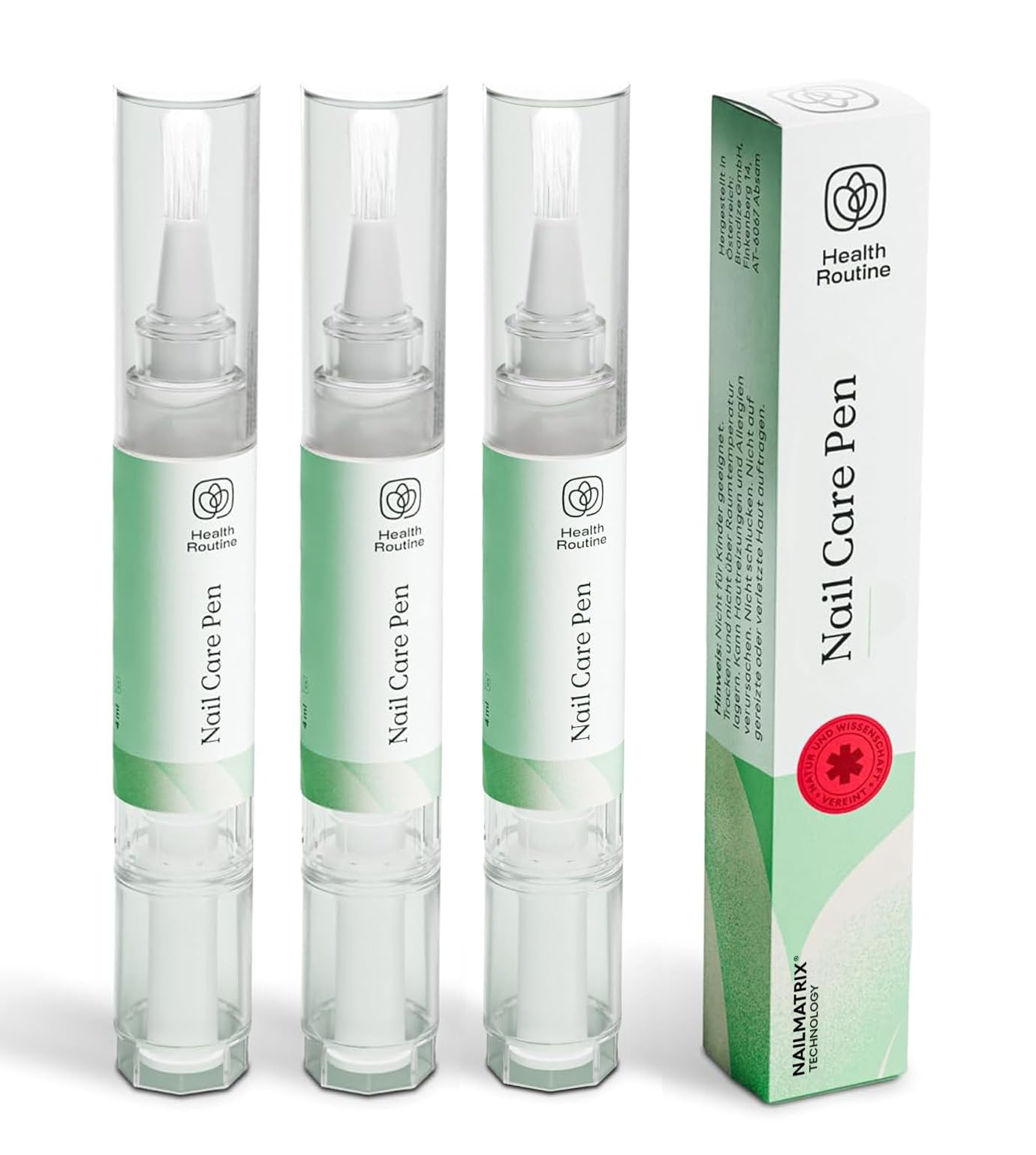 Easy application — Practical pen with precision brush allows targeted application, ideal for daily care of nails and nail edges. Unique Nail Matrix Technology — Opens the nail at the cellular level so that active ingredients penetrate deep into the nail root for maximum effectiveness and care. Intensive hydration — Nourishes and hydrates deeply, reduces dryness and restores shine and suppleness for a visibly well-groomed and strong nail. Strengthens and Repairs — Treats brittle, split and discolored nails, promotes regeneration and strengthens the natural nail structure for healthy, resilient nails. Supports nail flakes — High-quality care complex with Tea Tree Oil, Aloe Vera and Vitamin E provides effective care and cosmetic support for nail fungus treatments.Health Routine Nail Care Pen 3-delige set, het origineel, cosmetische verzorging bij schimmelinfectie, snel en effectief, voor verzorgde vingernagels en teennagels, met theeboomolie, vitamine E en 3 pakketEenvoudige toepassing — Praktische pen met precisieborstel maakt gerichte aanbreng mogelijk, ideaal voor dagelijkse verzorging van nagels en nagelranden. Unieke Nail Matrix Technology — Opent de nagel op celniveau zodat actieve werkstoffen diep in de nagelwortel doordringen voor maximale effectiviteit en verzorging. Intensieve hydratatie — Voedt en hydrateert diep, vermindert droogheid en herstelt glans en soepelheid voor een zichtbaar verzorgde en sterke nagel. Versterkt en herstelt — Stemt af op broze, gespleten en verkleurde nagels, bevordert regeneratie en versterkt de natuurlijke nagelstructuur voor gezonde, weerbare nagels. Ondersteunt nagelschilfers — Hoogwaardig verzorgingscomplex met Tea Tree Oil, Aloe Vera en Vitamine E verzorgt effectief en ondersteunt cosmetisch bij nagelschimmelbehandelingen.