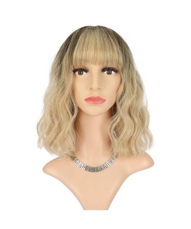 FAELBATY Ombre Blonde Wave Wig With Bangs Synthetic Cosplay Blonde Bob Wig for women Costume Wigs ombre (12" Black to blonde Color) black blonde