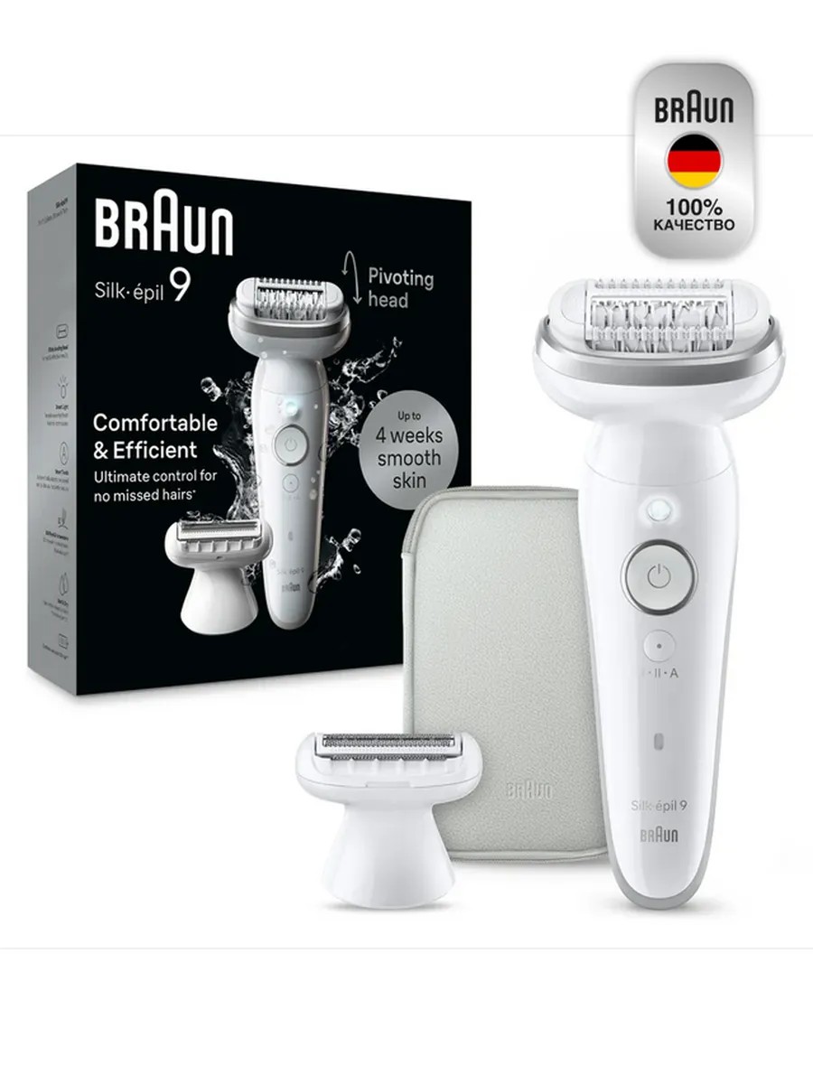 Тонкая эргономичная ручкаФорма с противоскользящей рукояткой становится особенно удобной при принятии душа и обеспечивает более легкое и точное движение – идеально подходит для удаления волос в труднодоступных местах.Гладкие подмышкиНосите свою любимую майку с уверенностью, что ваши подмышки будут мягкими и гладкими. Для очень чувствительных зон мы рекомендуем использовать входящую в комплект бритвенную головку.Используйте это повсеместноСделайте эпиляцию по всему телу, используя гибкую головку, чтобы легко добиваться сложных участков. Технология Micro-Grip с более широкой головкой на 40% удаляет больше волос одним движением для более эффективной эпиляции.Поддерживайте линию бикиниБудьте готовы провести день в бассейне без хлопот с эпиляцией, используя полностью гибкую головку для эпиляции без труда. Без боли. Никаких встреч. Только недели гладкой кожи.Пинцет Micro-GripБлагодаря широким, длинным и глубоким пинцетам Silk-épil 9 Flex с точностью удаляет даже самые короткие волоски, которые не могут уловить воск. Влажный и сухой 100% водонепроницаемый, вы можете делать эпиляцию в ванной или душе. При частом использовании в воде эпиляция становится практически безболезненной.Бритье и подстриганиеБритвенная головка превращает эпилятор в полнофункциональную бритву, а насадка триммера позволяет подстригать волосы, если хотите. Данный прибор можно использовать только после консультации врача относительно следующих случаев: экзема, ранки, инфекционные поражения кожи, такие как фолликулит (воспаление волосяного фолликула), варикозное расширение вен, круглые родинки, снижение иммунитета кожи, например, при сахарном диабете, во время беременности, при болезни Рейно, гемофилии, кандидозе или иммунодефиците.