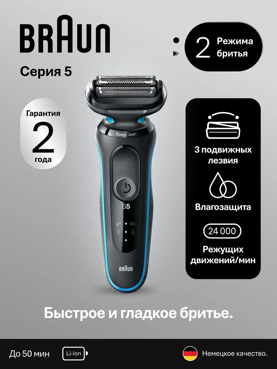 Мужская электробритва Braun Series 5 делает бритье легким благодаря трем плавающим лезвиями, которые подстраиваются под контуры вашего лица. Система EasyClean позволяет быстро и легко очистить лезвия без необходимости снимать бритвенную головку. Литий-ионный аккумулятор обеспечивает до 3 недель бритья и имеет функцию быстрой 5-минутной зарядки. Эта мужская электробритва является на 100% водонепроницаемой и подходит для влажного и сухого бритья. Совместима с системой EasyClick. Тип 5762.