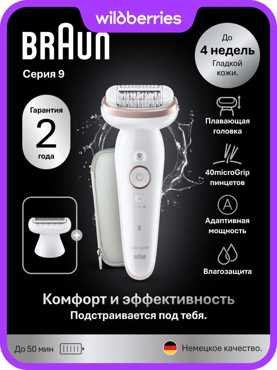 Профессиональный результат и безупречная гладкость кожи как в салоне вместе с лучшим аккумуляторным эпилятором Braun Silk- épil Серии 9, который обеспечивает гладкость кожи до 1 месяца, бережно удаляя волосы на всех участках тела. Эпилятор Silk- épil 9 SES9-030 обладает Технологией MicroGrip с 40 точными прочными пинцетами, удаляющими даже самые короткие волоски до 0,5мм, которые не способен удалить воск, и не цепляющими кожу. Широкая плавающая головка подстраивается под любые контуры и охватывает еще большую площадь эпиляции для самых быстрых результатов, а массажный роллер делает процесс максимально кофортным и деликатным. Женский эпилятор Braun Silk- épil 9 SES9-030 имеет надежную 100% влагозащиту Wet&Dry, и его можно использовать в душе или ванной для лучшего комфорта. Уникальная технология SmartTouch автоматически адаптирует скорость для наилучших результатов, а технология SmartLight подсвечивает даже мельчайшие волоски, чтобы быть уверенной в 100% результате.