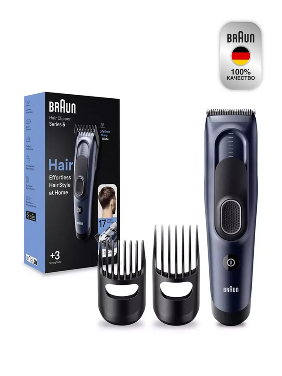 The Braun HC5350 hair clipper with 2 combs features ultra-sharp, life-long blades for a perfect haircut. Two smart attachments let you create the look and haircut of your dreams. With 16 cutting length settings, you can create a new style at any time. The small comb has 8 length settings from 3 to 24 mm, while the large comb allows for longer haircuts - from 14 to 35 mm. You can also get a very short haircut using the clipper without the attachment. Braun hair clipper blades are designed to stay sharp for a long time. Features: • 17 length settings: 2 smart cutting attachments allow you to create haircuts of different lengths. There is also an ultra-short length setting when working without attachments • Powerful dual battery provides continuous operation for the perfect haircut • Memory SafetyLock system conveniently locks and remembers the last used setting • Easy cleaning under running water.