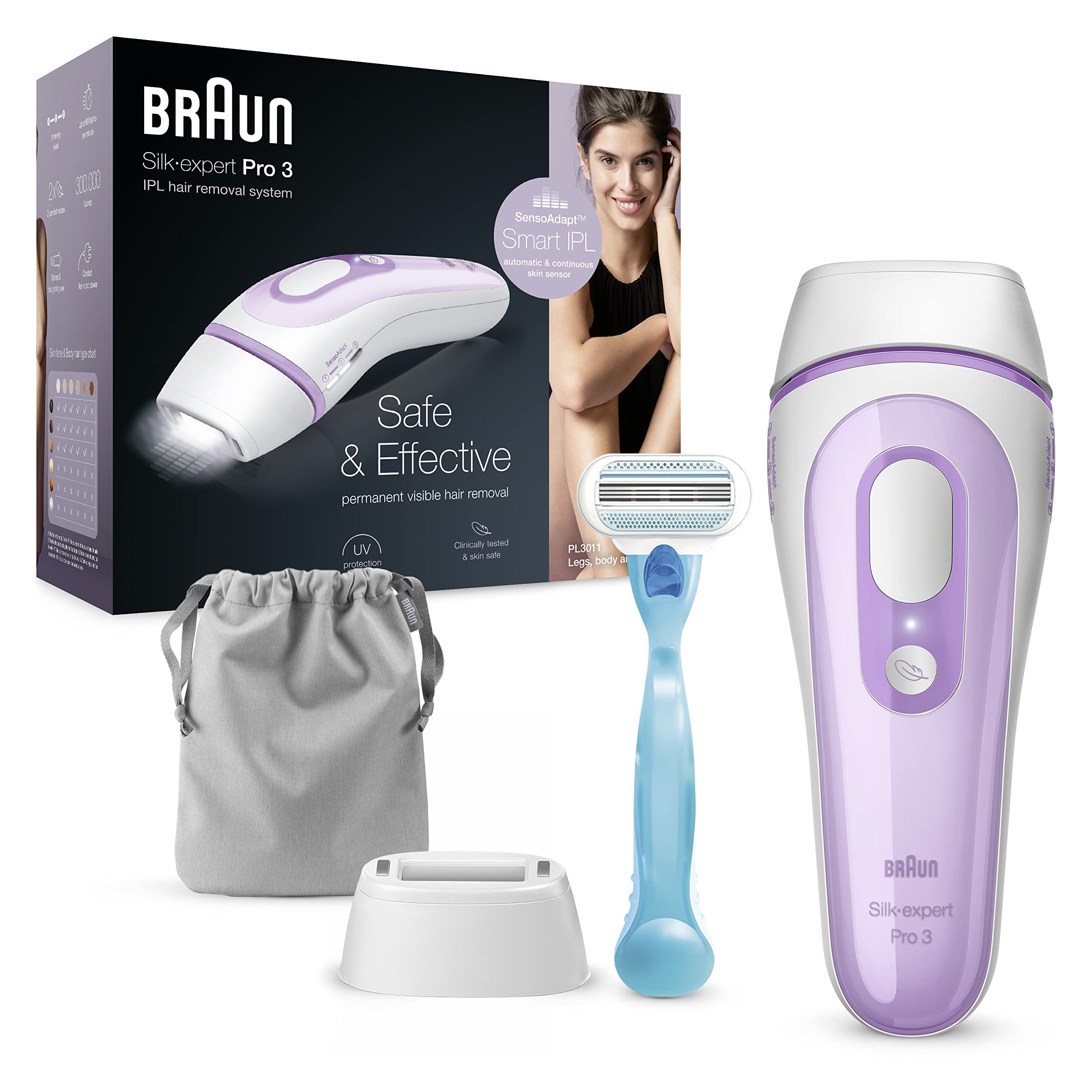 Silk-Expert Pro, Braun's latest IPL hair removal device.The Silk-Expert Pro 3 guarantees you a visible reduction in your hair growth in three months.The safest IPL technology of brown, clinically tested and dermatologically recognized by an internationally leading skin health organization (Skin Health Alliance) as skin-proof.The only IPL that adapts automatically and continuously to the skin tone to achieve safe and effective, visible and permanent hair removal.It also contains a premium storage bag for the comfortable storage and transport of the device and a venus razor for pretreatment.Receive results twice faster than with the previous Silk Expert 3: in just 9 minutes for both legs.300,000 light pulses, 20 percent more than the previous Silk Expert 3. Checked on lower legs, armpits and bikini sizons, in compliance with the treatment plan.The result can vary from person to person. Common technology with cyden. You can find more information on our website. Ingredients ingredients No1 attachment included in the packaging: standard attachment.New compact design, 15 percent smaller and 25 percent lighter, for simple handling and effortless treatment.300,000 light impulses, 20 percent more than the previous Silk Expert 3. Fast application: Treat both legs 2 times faster than the previous Silk Expert in just nine minutes.Intelligent IPL device with SensoAdaptTM skin sensor (with UV protection): The only IPL technology that automatically and continuously adapts to your skin tone.Braun's safest IPL technology.Clinically tested and dermatologically recognized as skin -proof by an international skin health organization (Skin Health Alliance).Brown the latest IPL hair removal device.Visible reduction in hair growth in three months.Silk-expert Pro, Brauns neuestes IPL-Haarentfernungsgerät. Der Silk- expert Pro 3 garantiert Ihnen eine sichtbare Verminderung Ihres Haarwuchses in drei Monaten. Die sicherste IPL-Technologie von Braun, klinisch getestet und dermatologisch von einer international führenden Hautgesundheitsorganisation (Skin Health Alliance) als hautsicher anerkannt. Das einzige IPL, das sich automatisch und kontinuierlich an den Hautton anpasst, um eine sichere und effektive, sichtbare und dauerhafte Haarentfernung zu erreichen. Es enthält auch einen Premium-Aufbewahrungsbeutel zum bequemen Aufbewahren und Transportieren des Geräts und einen Venus-Rasierer für die Vorbehandlung. Erhalten Sie Ergebnisse 2-mal schneller als mit dem vorherigen Silk expert 3: In nur 9 Minuten für beide Beine. 300.000 Lichtimpulse, 20 Prozent mehr als der vorherige Silk expert 3. Geprüft an Unterschenkeln, Achseln und Bikinizone, unter Einhaltung des Behandlungsplans. Das Ergebnis kann von Person zu Person unterschiedlich ausfallen. Gemeinsame Technologie mit Cyden. Weitere Informationen finden Sie auf unserer Webseite. INHALTSSTOFFE ZUTATEN Keine1 Aufsatz in der Verpackung enthalten: Standard-Aufsatz. Neues kompaktes Design, 15 Prozent kleiner und 25 Prozent leichter, für eine einfache Handhabung und eine mühelose Behandlung. 300.000 Lichtimpulse, 20 Prozent mehr als der vorherige Silk expert 3. Schnelle Anwendung: Behandeln Sie beide Beine in nur neun Minuten auf der niedrigsten Energiestufe 2-mal schneller als der vorherige Silk expert 3. Inklusive Premium-Aufbewahrungsbeutel und Venus-Rasierer. Intelligentes IPL-Gerät mit SensoAdaptTM-Hautsensor (mit UV-Schutz): Die einzige IPL-Technologie, die sich automatisch und kontinuierlich an Ihren Hautton anpasst. Die sicherste IPL-Technologie von Braun. Klinisch getestet und dermatologisch als hautsicher von einer internationalen Hautgesundheitsorganisation (Skin Health Alliance) anerkannt. Braun neuestes IPL-Haarentfernungsgerät. Sichtbare Verminderung des Haarwuchses in drei Monaten.Braun IPL Silk Expert Pro 3 Haarentfernungsgerät, für dauerhaft sichtbare Haarentfernung, Venus Rasierer, Alternative zur Laser Haarentfernung, Geschenk für Frauen, PL3011, weiß lila