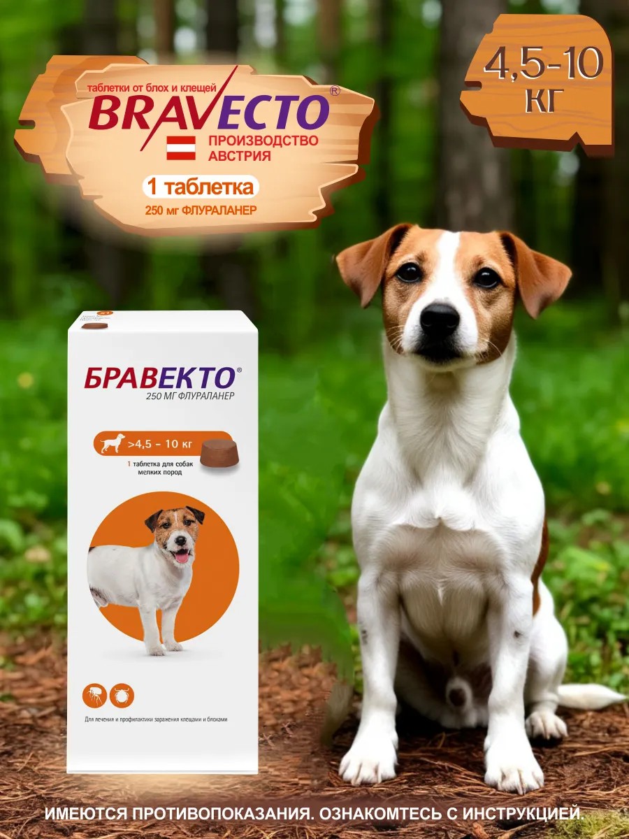 Bravecto chewable tablet for dogs 4.5-10 kg 250 mg. Indications: for the protection of dogs against ticks and fleas. Ingredients: Active ingredient, per tablet: fluralaner: 250 mg for dogs weighing 4.5-10 kg. Directions and dosage: 1 tablet for oral administration every 3 months.