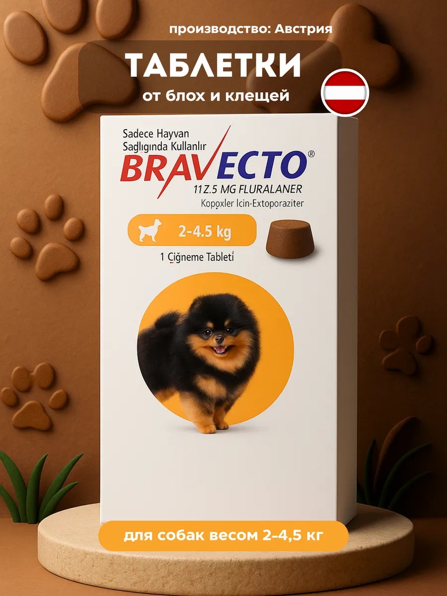 Bravecto 112,5/250/500/1000/1400 мг - это эффективное средство для защиты собак весом: от 2 до 4,5; от 4,5 до 10; от 10 до 20; от 20 до 40; от 40 до 56 кг от блох и клещей. Вы самостоятельно можете подобрать дозировку в зависимости от веса вашего питомца. Упаковка содержит одну таблетку, что обеспечивает длительную защиту собаки на 90 дней. Этот препарат действует быстро и надежно, обеспечивая защиту на срок до трех месяцев.
