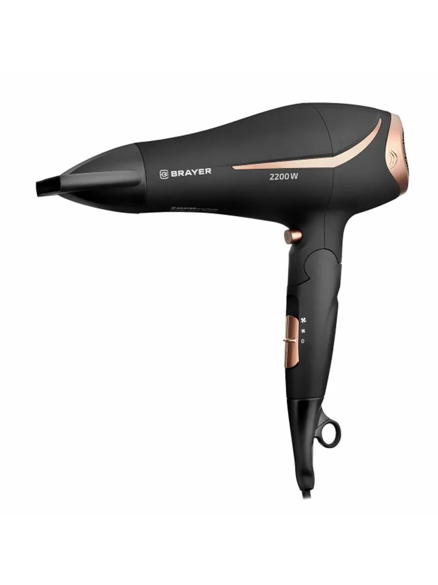 BRAYER BR3000BN Hair Dryer, 2200 W, 2 Speeds, 3 Temperature Settings, Folding Handle, Black. The Brayer BR3000BN is a versatile hair dryer for drying and styling hair at home or while traveling. It features a reliable safety feature that automatically pauses operation if the hair dryer overheats, ensuring long-lasting performance even with intensive use. For beautiful hair, the hair dryer features an advanced concentrator nozzle that precisely directs the airflow, as well as a cool shot function. The device offers two airflow speed settings and three temperature settings: cool air for setting your style, warm air for gentle drying, and hot air for quick drying. The BRAYER BR3000BN hair dryer boasts a stylish design and is easy to use. The ergonomic handle with a soft-touch anti-slip coating provides a comfortable grip, and the removable protective grill prevents debris, hair and dust from getting into the motor, making the device safe and durable. Thanks to the folding handle, the hair dryer is compact and easily fits into a bag or backpack, making it an ideal travel companion. For easy storage, the device can be hung on the bathroom or cabinet door. The manufacturer reserves the right to make changes to the specifications, package and design without prior notice that do not impair the performance of the product. Hair dryer type: household. Power: 2200 W. Air flow control (number of speeds): 2. Temperature control (number of modes): 3. Series: BR3000. Number of nozzles: 1 pc. Concentrator: yes. Cold air function: yes. Overheat shutdown: yes. Rubberized body coating: yes. Rubberized handle: yes. Storage loop: yes. Folding handle: yes. Power cord length: 1.8 m. Body material: plastic. Body color: black. Weight: 0.6 g. Brand - BRAYER. Manufacturer - China. Article - BR3000BN. Barcode