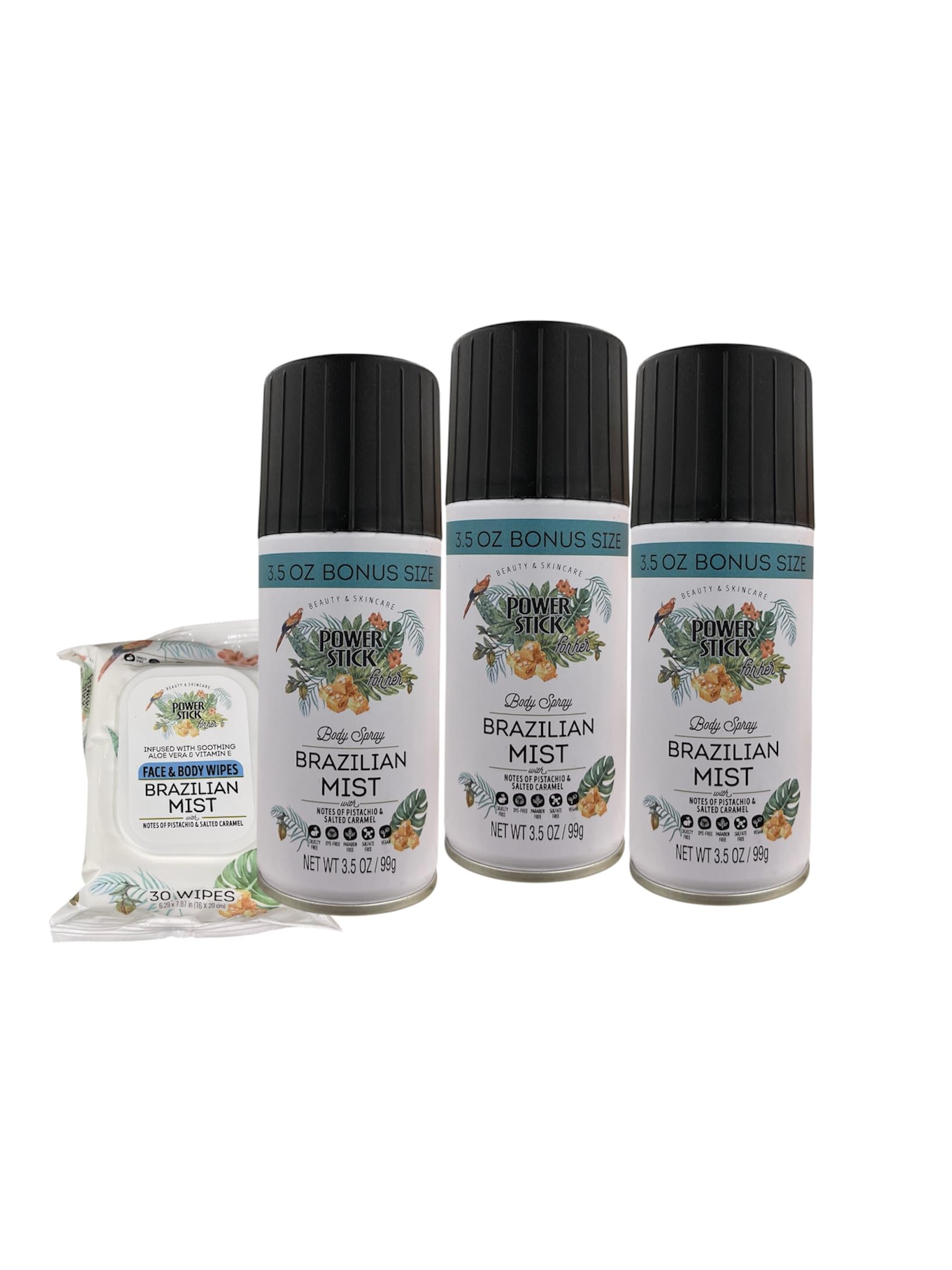 Brazilian Mist Body Spray Pistachio & Salted Caramel 3.5 oz Pack of 3 | Includes 1 Pack of 30 Face & Body Wipes