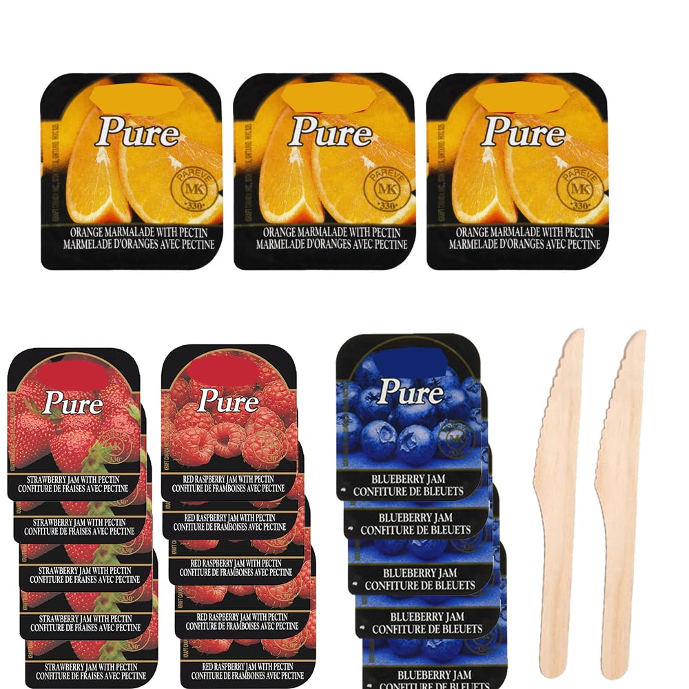 Indulge in a symphony of flavors with our Variety Pack of 30 Individual Portion On-the-Go Cups featuring an exquisite trio of Strawberry, Blueberry, Orange Marmalade, and Raspberry Jam Jellies! Each cup is a delightful burst of fruitiness, designed to bring joy and convenience to your snacking or meal-prepping routines. Whether you're a jam aficionado or simply love the taste of fresh, fruity spreads, this variety pack is your ticket to a delightful culinary experience. Our variety pack isn't just about flavors it's about the entire experience. Each portion is carefully crafted to preserve the natural taste of fresh fruits, ensuring you get the best in every bite. Perfect for breakfast spreads, quick snacks, or even as a thoughtful gift, this set caters to all occasions and preferences. To enhance your experience, this set comes with two elegant wooden knives, perfect for spreading your favorite jam smoothly, and a one-of-a-kind sticker by PaLiSoL CREATiONS, adding a touch of artistry to your collection. Dive into the flavors of Strawberry Jelly, Raspberry Jelly, Blueberry Jelly, and Orange Marmalade with ease and convenience. Key Features: ? Bursting with Flavor: Strawberry Jelly Pure Indulgence: Each cup of strawberry jelly is packed with the sweet, tangy essence of ripe strawberries, offering a delightful taste that transports you to a sunny strawberry field with every bite. Convenient Portions: Our individual cups ensure you have the perfect amount of jelly for your toast, bagel, or snack without any waste. Natural Goodness: Made from high-quality strawberries, this jelly retains all the natural flavors and health benefits of the fruit. Versatile Use: Ideal for breakfast, desserts, or even as a sweet addition to savory dishes. Kid-Friendly: Perfect for lunchboxes or quick snacks, your kids will love the rich strawberry taste. ? Delight in Blueberry Bliss: Blueberry Jelly Rich and Tasty: Experience the robust flavor of blueberries, carefully crafted into a smooth, spreadable jelly that's perfect for any time of the day. On-the-Go Convenience: Enjoy the ease of individual portions that fit perfectly into your busy lifestyle. Health Benefits: Blueberries are known for their antioxidant properties, making this jelly a delicious and healthy choice. Perfect Pairing: Pair it with your favorite bread, crackers, or even mix into yogurt for a delightful treat. Artisan Quality: Each cup is made with care, ensuring the highest quality and taste. ? Zesty and Sweet: Orange Marmalade Unique Flavor: Our orange marmalade captures the perfect balance of sweet and tangy, made from the finest oranges to brighten your day. Ideal Portions: The single-serving cups are ideal for a quick breakfast or a sophisticated addition to your cheese board. Gourmet Experience: Elevate your culinary creations with the rich taste of our carefully prepared marmalade. Refreshing Taste: Perfect for adding a citrus twist to your meals, from breakfast toast to glazes for meats. Premium Ingredients: Made from real oranges, ensuring a fresh and authentic taste in every cup. ? Classic and Bold: Raspberry Jelly Exquisite Taste: Relish the bold, tangy flavor of our raspberry jelly, perfect for those who love a mix of sweet and tart. Ready to Use: The individual portions make it easy to grab and go, fitting seamlessly into your daily routine. Nutrient-Rich: Raspberries are packed with vitamins and minerals, making this jelly a tasty and nutritious choice. Versatile Delight: Use it as a spread, a filling for pastries, or a topping for ice cream for an indulgent treat. Homemade Feel: Crafted to bring a homemade feel and taste, each cup is a mini jar of joy. ? Unique Extras: Wooden Knives PaLiSoL CREATiONS Sticker Elegant Spreaders: The two included wooden knives are not only functional but add a touch of elegance to your dining experience. Perfect Spread: Designed to provide a smooth spreading action, making your jelly experience even more enjoyable. Artistic Touch: The exclusive sticker by PaLiSoL CREATiONS adds a unique flair, perfect for personalizing your belongings or as a collector's item. Eco-Friendly: The wooden knives are eco-friendly, aligning with sustainable practices and reducing plastic waste. Gift-Ready: The artistic sticker makes this variety pack a perfect gift for friends and family, adding a personalized touch to your present.? Assorted Berry Medley: Experience the joy of a diverse berry medley with the combined goodness of strawberry, blueberry, and raspberry jams in one delightful package. ? Travel-Friendly: Each individual pack is perfectly portioned, making it ideal for on-the-go snacking, picnics, and travel. ? Versatile and Creative: Elevate your culinary creations by using these jams in a variety of ways – from breakfast spreads to dessert toppings. ? Bursting with Berry Goodness: Our jams are made from premium, handpicked berries, ensuring a burst of fresh and natural flavors in every bite. ? Thirty Individual Packs: Enjoy the convenience of 30 separate packs, each containing a delectable serving of strawberry, blueberry, or raspberry jam.