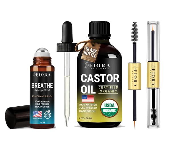 CASTOR OIL FOR EYELASHES AND EYEBROWS - Our pure Castor oil promotes lash brow growth. The glass dropper mascara tube ensures precision application and hygienic reusable brush storage. Experience longer lashes fuller brows with regular usage. USDA CERTIFIED ORGANIC CASTOR OIL - 100 Natural, cold-pressed, pure, undiluted oil with no additives or fillers. Packaged in DARK GLASS BOTTLE to prevent oxidation. Comes with MESS- FREE mascara tube with dual applicators for eyelashes and eyebrows. Glass dropper included for easy application to scalp and hair. Packaged in the USA. SENSORY ESCAPE ON DEMAND: Awaken your senses with every roll. Whether you're eg into a self-care ritual or seeking a moment of calm, this breath oil essential oil with clean and uplifting aroma fits seamlessly into mindful routines—just apply to pulse points and breathe in the clarity. CRISP, REFRESHING AROMA: Let the cool, minty scent of our breathe ease essential oil roll-on infuse your day with a breath of fresh air. This revitalizing blend brings a sense of clarity and freshness to your surroundings, perfect for stuffy rooms, long commutes, or just a midday pick-me-up. HIGHEST QUALITY BREATHE BLEND- A refreshing blend of 7 therapeutic grade Essential oils - Eucalyptus, Peppermint, Tea tree, Pine needle, Laurel leaf, Cardamom, and Lemon. 100 pure, gentle, and effective non-GMO natural essential oil. No toxins, or additives. Unfiltered and undiluted. Pure therapeutic grade. Steam distilled. Made in the USA.