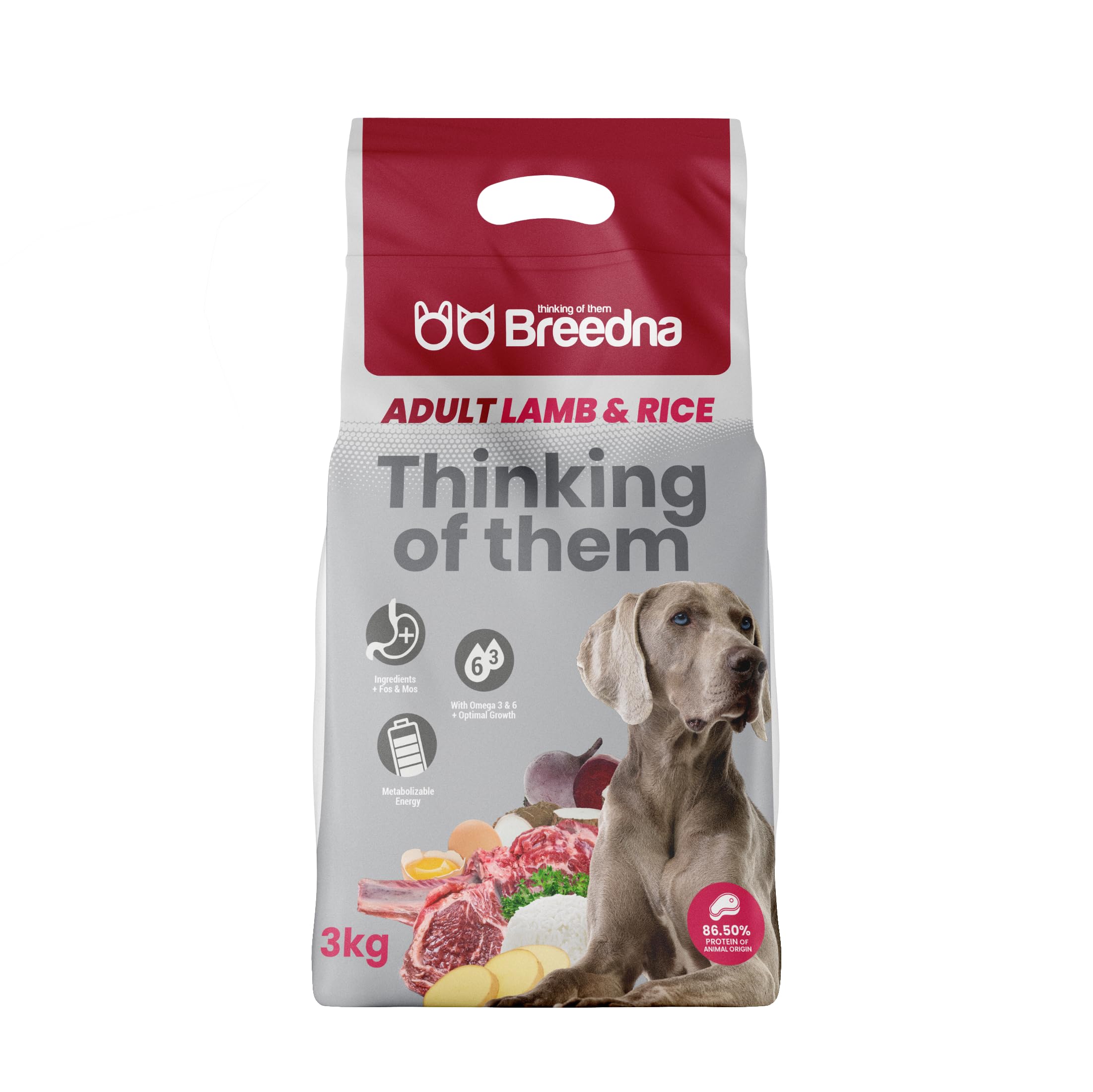 BREEDNA PET FOOD - We know that every pet is unique and deserves the best. That's why we strive to offer a variety of pet products and foods tailored to specific needs, made with only the highest quality ingredients. Our holistic approach to animal health and welfare drives us to constantly innovate and exceed the highest quality standards, so that every dog and cat enjoys a life full of vitality. DEVELOPMENT AND VITALITY - This super premium dog food contains natural sources of omega 3 and 6 that contribute to a healthy and shiny skin and coat. The kibble structure promotes dental health, ensuring a healthy and complete diet. Enriched with vitamins. ADVANCED NUTRITION - The adult dog food is enriched with FOS and MOS prebiotics that strengthen their immune and digestive systems, and beet pulp to promote healthy digestion. It contains ingredients such as hemoglobin and chicken fat, rich in essential nutrients. Medicinal plant extracts improve intestinal health, while natural antioxidants and yucca extract promote a strong immune system. MUSCLE AND BONE SUPPORT - This kibble contains free-range egg membrane, a natural chondroprotector that provides glucosamine, collagen, chondroitin, and hyaluronic acid, to prevent injuries and joint diseases such as osteoarthritis and osteoporosis and reduce pain, in addition to its anti-inflammatory action. Enriched with calcium and vitamin E to promote muscle development. ADULT LAMB RICE - This kibble contains dehydrated lamb as the main ingredient. 86.5 animal protein. This dog food is designed for adult dogs with normal physical activity.BREEDNA PET FOOD - Nous savons que chaque animal est unique et mérite le meilleur. C'est pourquoi nous nous efforçons d'offrir une variété de produits et aliments pour animaux adaptés aux besoins spécifiques, composés uniquement d'ingrédients de la plus haute qualité. Notre approche globale de la santé et du bien-être animal nous pousse à innover constamment et à dépasser les normes de qualité les plus exigeantes, pour que chaque chien et chat profite d'une vie pleine de vitalité. DÉVELOPPEMENT ET VITALITÉ - Cette nourriture pour chien super premium contient des sources naturelles d'oméga 3 et 6 qui contribuent à une peau et un pelage sains et brillants. La structure des croquettes favorise la santé dentaire, garantissant une alimentation saine et complète. Enrichi en vitamines. NUTRITION AVANCÉE - La nourriture pour chiens adultes est enrichie en prébiotiques FOS et MOS qui renforcent leur système immunitaire et digestif, et en pulpe de betterave pour favoriser une digestion saine. Elle contient des ingrédients tels que l'hémoglobine et la graisse de poulet, riches en nutriments essentiels. Les extraits de plantes médicinales améliorent la santé intestinale, tandis que les antioxydants naturels et l'extrait de yucca favorisent un système immunitaire fort. SOUTIEN MUSCULAIRE ET OSSEUX - Ces croquettes contiennent de la membrane d'œuf de poules élevées en plein air, un chondroprotecteur naturel qui fournit de la glucosamine, du collagène, de la chondroïtine et de l'acide hyaluronique, pour prévenir les blessures et les maladies articulaires telles que l'arthrose et l'ostéoporose et réduire la douleur, en plus de son action anti-inflammatoire. Enrichi en calcium et en vitamine E pour favoriser le développement des muscles. ADULT LAMB RICE - Ces croquettes contiennent de l'agneau déshydraté comme ingrédient principal. 86,5 de protéines d'origine animale. Ces croquettes pour chien sont conçues pour les chiens adultes ayant une activité physique normale.