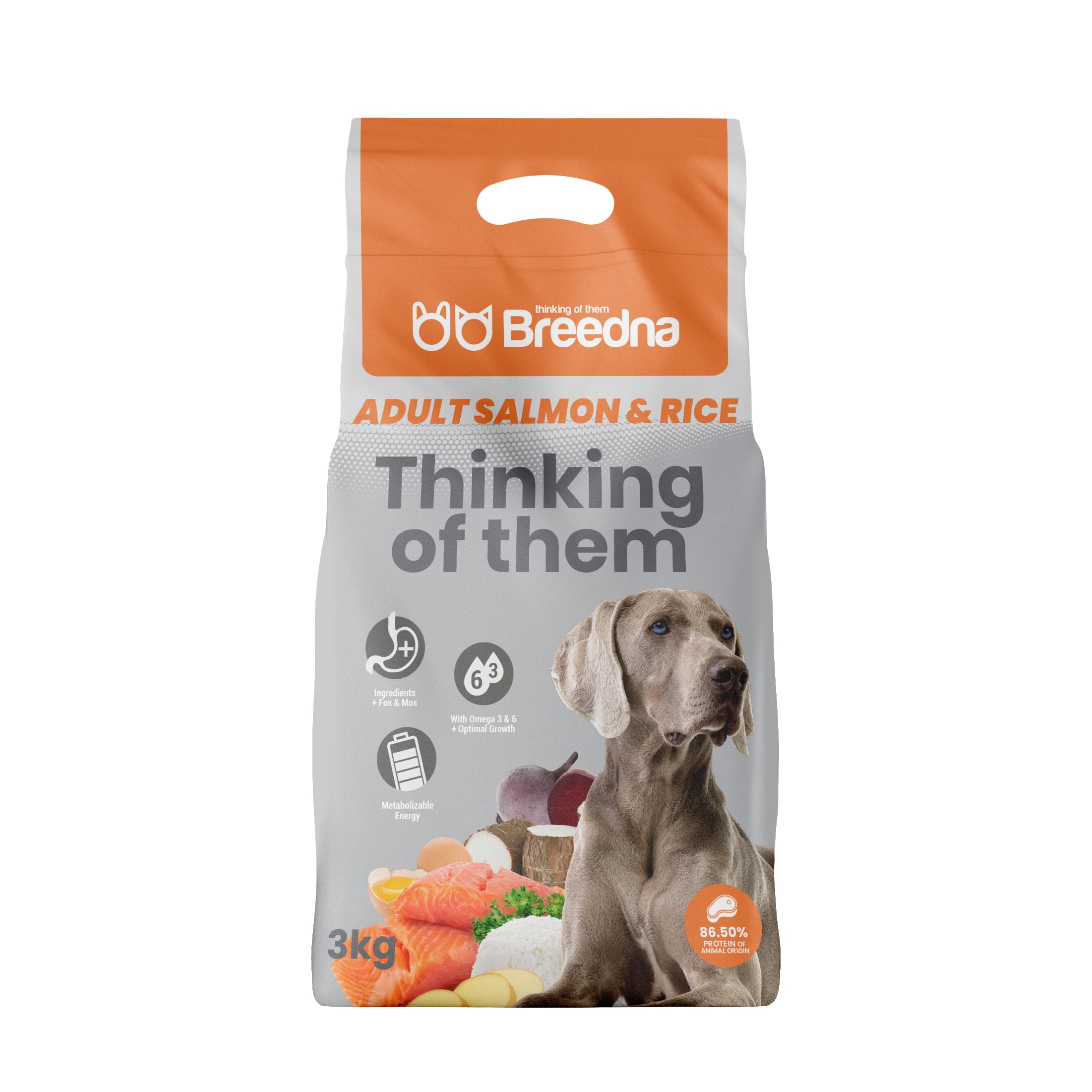 BREEDNA PET FOOD - We know that every pet is unique and deserves the best. That's why we strive to offer a variety of pet products and foods tailored to specific needs, made with only the highest quality ingredients. Our holistic approach to animal health and welfare drives us to constantly innovate and exceed the highest quality standards, so that every dog and cat enjoys a life full of vitality. DEVELOPMENT AND VITALITY - This super premium kibble contains natural sources of omega 3 and 6 that contribute to a healthy and shiny skin and coat. The kibble structure promotes dental health, ensuring a healthy and complete diet. Enriched with vitamins. ADVANCED NUTRITION - The formula is enriched with FOS and MOS prebiotics that strengthen their immune and digestive systems, and beet pulp to promote healthy digestion. It includes ingredients such as hemoglobin, chicken fat, and salmon oil, rich in essential nutrients. Medicinal plant extracts improve intestinal health, while natural antioxidants and yucca extract promote a strong immune system. MUSCLE AND BONE SUPPORT - These kibbles contain free-range egg membrane, a natural chondroprotector that provides glucosamine, collagen, chondroitin, and hyaluronic acid, to prevent injuries and joint diseases such as osteoarthritis and osteoporosis and reduce pain, in addition to its anti-inflammatory action. Enriched with calcium and vitamin E to promote muscle development. ADULT SALMON RICE - These salmon kibbles contain dehydrated salmon as the main ingredient. 86.5 animal protein for exceptional nutrition. These dog kibbles are designed for adult dogs with normal physical activity.BREEDNA PET FOOD - Nous savons que chaque animal est unique et mérite le meilleur. C'est pourquoi nous nous efforçons d'offrir une variété de produits et aliments pour animaux adaptés aux besoins spécifiques, composés uniquement d'ingrédients de la plus haute qualité. Notre approche globale de la santé et du bien-être animal nous pousse à innover constamment et à dépasser les normes de qualité les plus exigeantes, pour que chaque chien et chat profite d'une vie pleine de vitalité. DÉVELOPPEMENT ET VITALITÉ - Ces croquettes super premium contiennent des sources naturelles d'oméga 3 et 6 qui contribuent à une peau et un pelage sains et brillants. La structure des croquettes favorise la santé dentaire, garantissant une alimentation saine et complète. Enrichi en vitamines. NUTRITION AVANCÉE - La formule est enrichie en prébiotiques FOS et MOS qui renforcent leur système immunitaire et digestif, et en pulpe de betterave pour favoriser une digestion saine. Il comprend des ingrédients tels que l'hémoglobine, la graisse de poulet et l'huile de saumon, riches en nutriments essentiels. Les extraits de plantes médicinales améliorent la santé intestinale, tandis que les antioxydants naturels et l'extrait de yucca favorisent un système immunitaire fort. SOUTIEN MUSCULAIRE ET OSSEUX - Ces croquettes contiennent de la membrane d'œuf de poules élevées en plein air, un chondroprotecteur naturel qui fournit de la glucosamine, du collagène, de la chondroïtine et de l'acide hyaluronique, pour prévenir les blessures et les maladies articulaires telles que l'arthrose et l'ostéoporose et réduire la douleur, en plus de son action anti-inflammatoire. Enrichi en calcium et en vitamine E pour favoriser le développement des muscles. ADULT SALMON RICE - Ces croquettes au saumon contiennent du saumon déshydraté comme ingrédient principal. 86,5 de protéines animales pour une nutrition exceptionnelle. Ces croquettes pour chien sont conçues pour les chiens adultes ayant une activité physique normale.