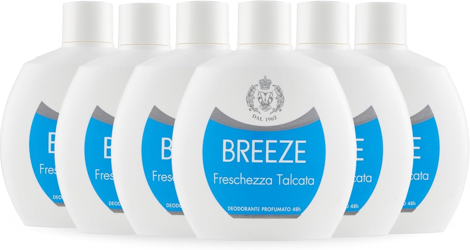 BREEZE: A historic brand that was born in the 1960s and immediately achieved great success with consumers thanks to its unique character. The product that launched Breeze was the Squeeze deodorant, innovative in both its formulation and its original round white packaging. Over the years, Breeze has expanded its product range by developing different formats: spray, roll-on, No Gas spray, shower gels, and the Breeze Men line dedicated to men. Directions for use: Squeeze while holding the bottle upright. The "Full" marking indicates the correct fill level. Avoid contact with eyes and mucous membranes. Do not use on freshly shaved or irritated skin. Features: Transparent and helps reduce the formation of white residue on fabrics. Dermatologically tested. Formula: It is formulated without gas and without aluminum salts. It does not interfere with the skin's normal perspiration process, allowing it to "breathe." Precise freshness: guarantees effective deodorant action for up to 48 hours. Offers freshness and protection. Fragrance: talc, iris, and musk notes.