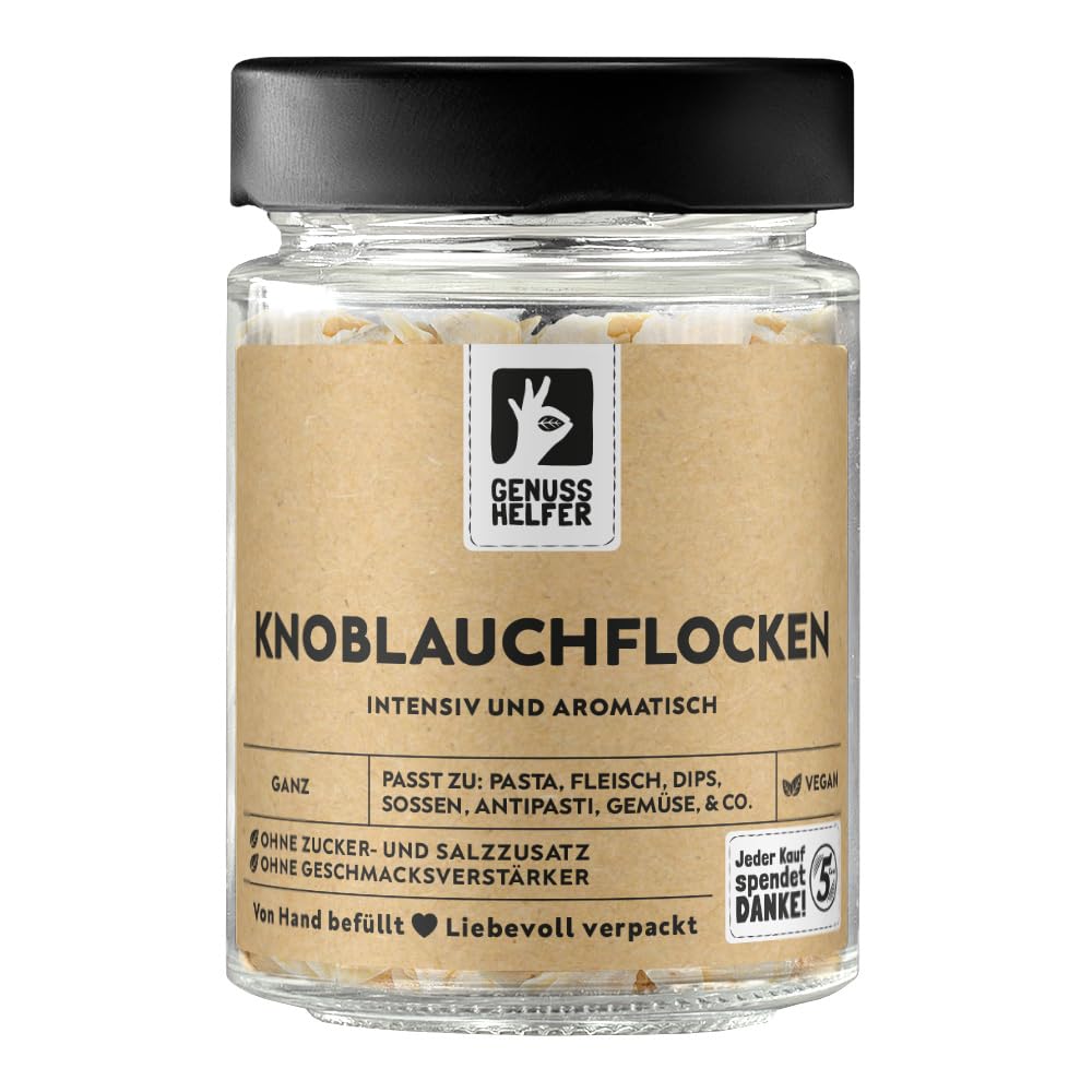 100 natural talent: We attach great importance to only using high -quality raw materials.The only quality counts for us!.Gourmet helpers: As part of our pleasure helper initiative, we donate five cents from the Bremen spice trade to social projects for each product sold.Help together and enjoy!.Sustainable glass: Our recoverable glasses not only look pretty, but are also extremely useful.Due to the airtight closure, the content lasts significantly longer.In addition, they are reusable after use and are therefore particularly sustainable.Versatile enjoyment: With our garlic flakes you can give your dishes a strong and hearty note.Use them in soups and sauces or as a spice for meat, poultry, fish and vegetables.The possibilities are endless!.Kitchen friend: Our garlic flakes offer you a practical and tasteful solution to give your dishes the unmistakable garlic taste without having to peel or chop fresh garlic.