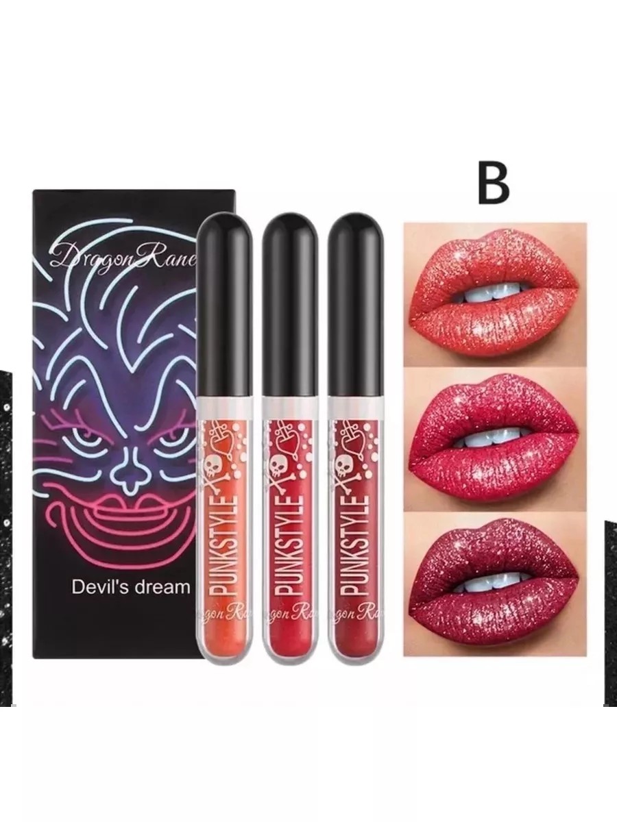 Dragon Ranee Devil's Dream Halloween Diamond Lip Gloss Waterproof Lip Gloss Set. Diamond glitter lip gloss/Shimmery liquid lip gloss/Shimmery liquid lipstick. Easy to wear, convenient to carry. A set of 3 matte lipsticks in a very stylish design. The most trendy colors, excellent durability and easy application.