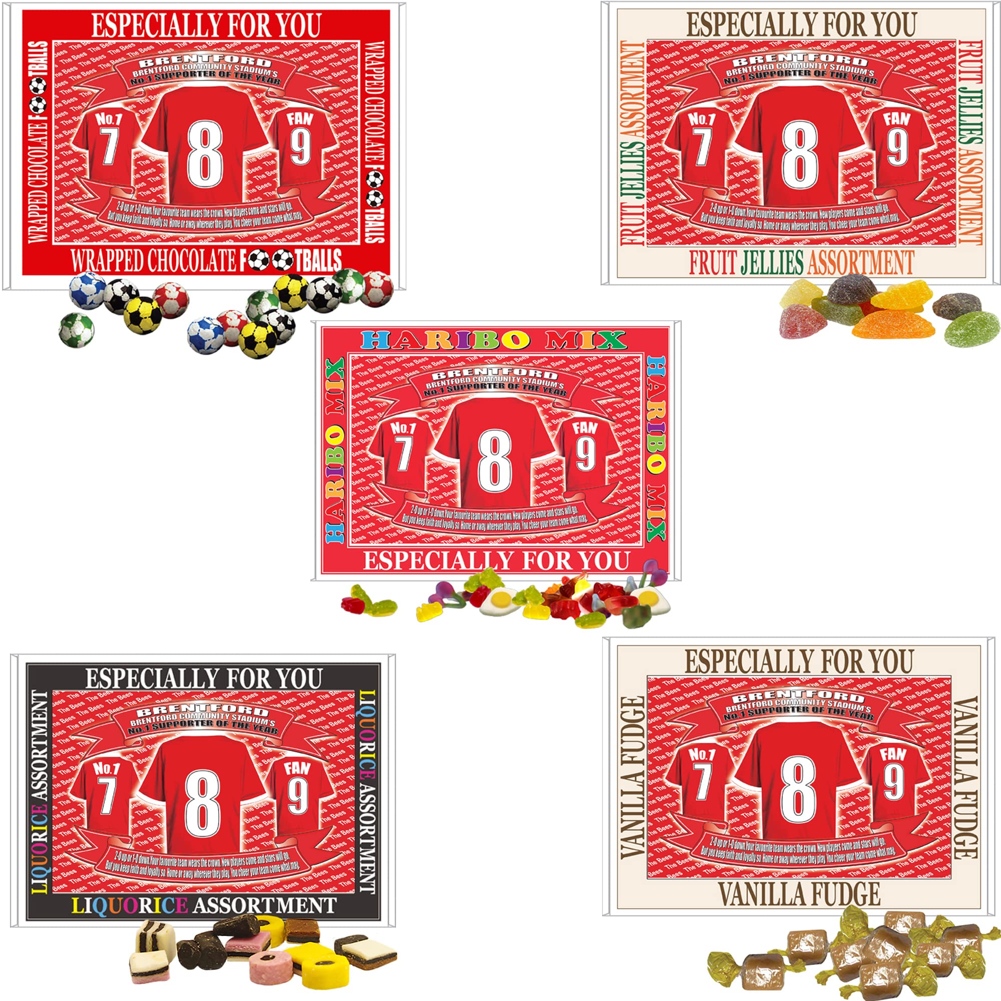 A perfect gift for any avid BEES FAN. Your favourite football team's shirt image printed onto a box lid containing 200g of your favourite sweets. Ingredients: LIQUORICE ASSORTMENT: Sugar, treacle, wheat flower , glucose syrup, desiccated coconut, vegetable oil, beef gelatine, cornflower, humectant, glycerol, natural colours, plain caramel, beetroot red, curcumin, anthocyanins, capsanthin, fat-reduced cocoa powder, liquorice powder, flavourings, glazing agent. Fruit and vegetable concentrates: Blackurrant, carrot and radish. This product contains wheat. VANILLA FUDGE Assortment Sugar, glucose syrup, full cream condensed milk (milk sugar), vegetable oils (palm kernel palm stearin oil), butter (milk), salt, emulsifier: soya lecithin flavourings. This product may contain egg and nut traces. FRUIT JELLIES ASSORTMENT: Sugar, glucose syrup, water, gelling agent, pectin acid: lactic acid flavourings. Colours: Anthocyanins. Chlorophylls, curcumin, capsanthin. This product may contain nuts, milk, sesame seeds and gluten. CHOCOLATE BALLS Ingredients: Sugar, vegetable oil (palm kernel), whey powder (milk), reduced fat cocoa powder, sorbitan tristearate, soya lecithin, natural bourbon vanilla. Allergens: Milk Soya. FRUIT GUMMIES MIX Sugar, Glucose syrup, dextrose, spirulina, starch, gelatine, acid, citric acid, palm fat, watergelatine, caramelised sugar syrup, flavouring fruit and plant concentrates apple, aronia, blackcurrant, elderberry, grape, kiwi, lemon, mango, nettle, orange, carrot, passion fruit, spinach glazing agents: beeswax carnauba wax, palm fat, water gelatine, colour: copper complexes to chlorophyll, invert sugar syrup elderberry extract, carob extract Any image or text displayed on this unofficial product has been independently produced and is in no way connected with, or endorsed by, the personalities, people, agents or organisations they may appear to depict. INGREDIENTS Liquorice Assortment Sugar, treacle, wheat flower , glucose syrup, desiccated coconut, vegetable oil, beef gelatine, cornflower, humectant, glycerol, natural colours, plain caramel, beetroot red, curcumin, anthocyanins, capsanthin, fat-reduced cocoa powder, liquorice powder, flavourings, glazing agent. Fruit and vegetable concentrates: Blackurrant, carrot and radish. This product contains wheat. Vanilla Fudge Assortment Sugar, glucose syrup, full cream condensed milk (milk sugar), vegetable oils (palm kernel palm stearin oil), butter (milk), salt, emulsifier: soya lecithin flavourings. This product may contain egg and nut traces. Fruit Jellies Assortment Sugar, glucose syrup, water, gelling agent, pectin acid: lactic acid flavourings. Colours: Anthocyanins. Chlorophylls, curcumin, capsanthin. This product may contain nuts, milk, sesame seeds and gluten.Manufactured in the UK. Supporting UK Small Businesses. Perfect Gift for Any Occasion.