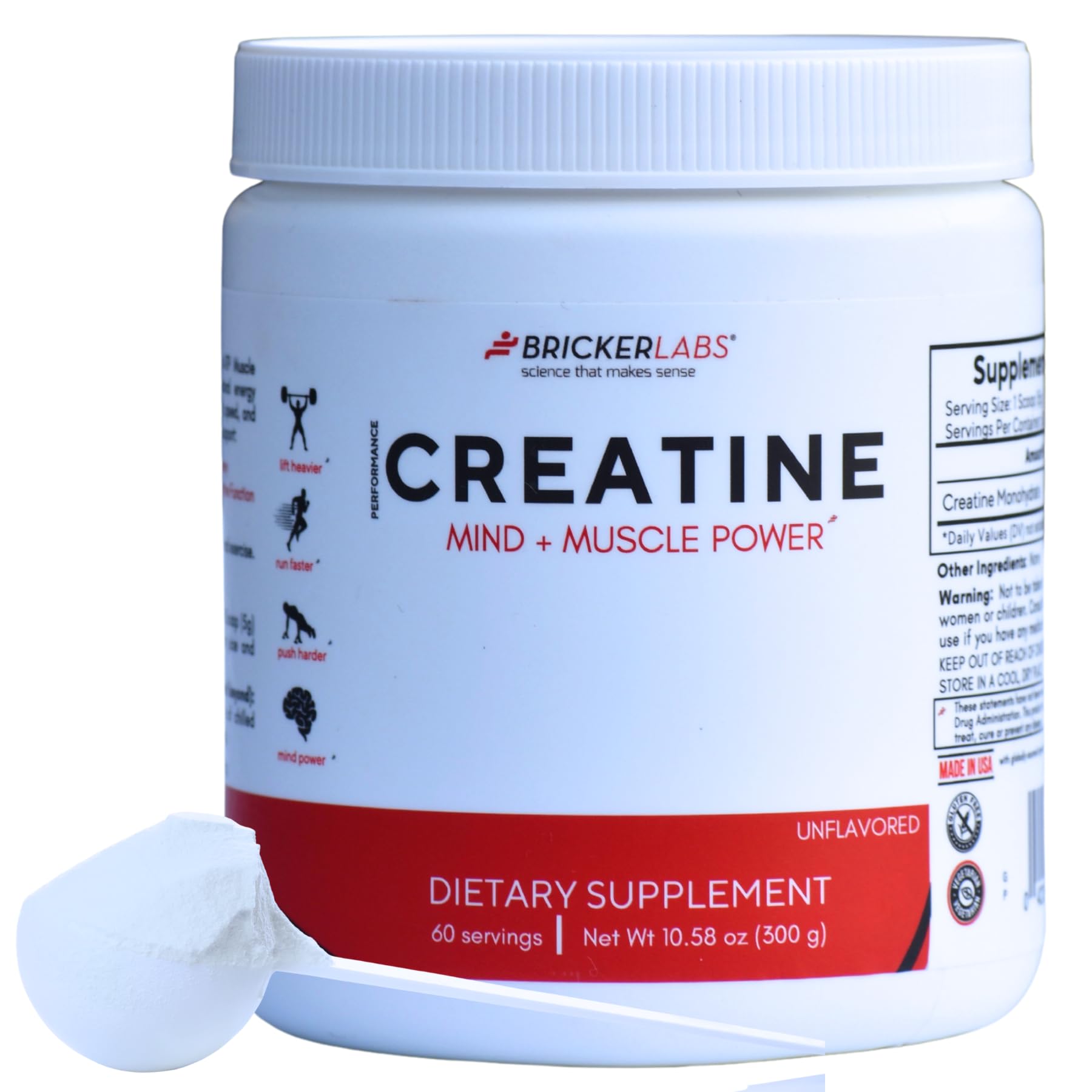 Bricker Labs Creatine Monohydrate Powder 5g Pure Ultra-Fine Creatine per Serving Muscle Growth Strength Endurance & Focus Unflavored 60 Servings Workout & Cognitive Support for Men & Women