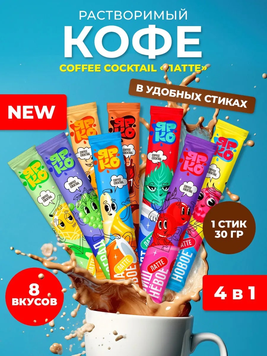 ЯРКО и DES Кофе 3 в 1 Cocktail «ЛАТТЕ» в стиках 8 вкусов по 30 гр