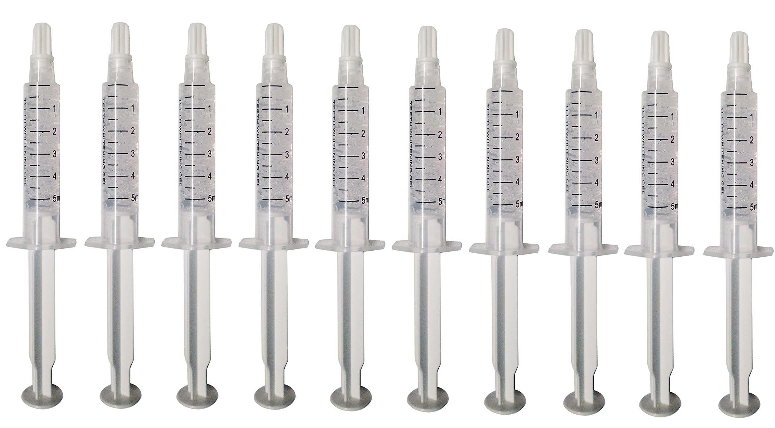 Whiter, Brighter Teeth in 15 Minutes. Most everyone notices a 2-5 shade difference after the very first teeth whitening treatment with our product. It can take up to a week to be fully satisfied. Teeth Whitening Gels can quickly and safely remove all cigarette, coffee and tea stains that have been formed through the years, help you find your smile. Teeth Whitening kit includes 10 5cc ml 35 carbamide peroxide syringes and instructions for usage. Teeth whitening light and Trays are not included . Our Teeth Whitening Refill Gel is absolutely safe for your sensitive teeth and gums, because of its all natural ingredients. Most people see noticeable whitening results after the first treatment. Manufactured at Dentech Laboratory in USA. Our carbamide peroxide gel syringes are filled fresh daily ensuring maximum shelf life, These XL 5cc ml syringes will last you a very long time.
