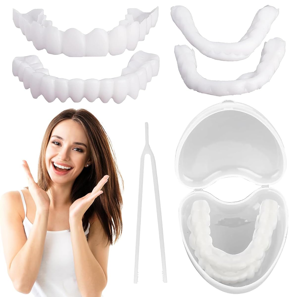 Veneers, cosmetic teeth - Temporary Smile Comfort Fit Flex cosmetic teeth, one size, comfortable top and bottom veneers - Dental veneers (bottom top) Features: - False teeth dentures - Fake braces fake tooth cover - Click facings - Perfect Smile veneers - Click prosthesis - Comfort Fit teeth, one size, fits all Instructions for use: 1. Place the tooth in boiling (almost boiling) water for a minute. This makes them more flexible and adaptable at any time. 2. Place the smiling teeth firmly on the existing teeth with a mirror. Press firmly on the tooth and then gently touch the material behind the real tooth with your thumb. 3. After 30 seconds, carefully remove the tooth from the mouth and place it in a glass of cold water to cool. The material turns white after curing. 4. Enjoy a perfect smile! Specifications: Item type: Whitening braces Colour: White Suitable age: over 12 years old Package contents: 2 x Instant veneers (including upper and lower teeth) Note: ? For cosmetic purposes only. ? Do not eat or sleep while using this product. ? Clean after use. Service: ✓ Thank you for purchg our products. If you have any questions, please feel free to contact us. We will respond within 24 hours.? Way to use: Each box contains a pair of false teeth top and bottom smile veneers and a pair of enamel adhesives, which dissolve and soften when exposed to hot water It can then be applied directly to the teeth with whitening tooth cover, with beautiful large white teeth. ? Convenient to Use: The cosmetic denture teeth are suitable for covering irregular, stained, missing and cracked teeth Whether you are going on a date, taking a photo or going to a party, it is convenient to take veneer artificial teeth with you everywhere, saving you a lot of time and energy. ? Gives you confidence: The instant temporary teeth filling is designed in the right shape to cover bent, stained, missing and incomplete teeth, practical for use and replacement in daily life Bring you a bright smile to show your confidence and have a beautiful day. ? Material: (fifth generation dental veneers) veneer teeth are made of silica gel, non-toxic and harmless, can give you the freedom to smile and drink without feeling any discomfort in your mouth when you wear a reusable temporary smile device. ? Fast Whitening: The cosmetic teeth feature teeth whitening made with ultra-thin technology, which fits well with your teeth to give you a set of white teeth immediately, almost no one will notice that you are actually wearing dentures.Valse Tanden, 2 Stuks Clip-In Fineer Tanden, Instant Cosmetische Fineertanden Boven- En Onderset, Tijdelijke Glimlach Neptanden, Comfort Fit Kunstgebit Voor Dekking Van Slechte Tanden Facings, cosmetische tanden - Tijdelijke Smile Comfort Fit Flex cosmetische tanden, één maat, comfortabele boven- en onderfacing - Tandfacing (onder boven) Eigenschappen: - Valse tanden kunstgebit - Neppe beugel neptandoverkapping - Klikfacings - Perfect Smile facings - Klikprothese - Comfort Fit tanden, één maat, past iedereen Gebruiksaanwijzing: 1. Leg de tand een minuut in kokend (bijna kokend) water. Hierdoor worden ze flexibeler en passen ze zich op elk moment aan. 2. Plaats de lachende tanden met een spiegel stevig op de bestaande tanden. Druk stevig op de tand en raak vervolgens voorzichtig het materiaal achter de echte tand aan met uw duim. 3. Haal de tand na 30 seconden voorzichtig uit de mond en plaats deze in een glas koud water om af te koelen. Het materiaal wordt wit na uitharding. 4. Geniet van een perfecte glimlach! Specificaties: Type artikel: Whitening beugels Kleur: Wit Geschikte leeftijd: ouder dan 12 jaar Verpakkingsinhoud: 2 x Instant facings (inclusief boven- en ondertanden) Opmerking: ? Alleen voor cosmetische doeleinden. ? Niet eten of slapen tijdens het gebruik van dit product. ? Reinig na gebruik. Service: ✓ Hartelijk dank voor uw aankoop van onze producten. Als u vragen heeft, neem dan gerust contact met ons op. Wij zullen binnen 24 uur reageren.? Manier om te gebruiken: elke doos bevat een paar valse tandentop- en onderglimlachfineer en een paar emaillelijmen, die oplossen en verzachten bij blootstelling aan heet water Vervolgens kan het direct met whitening tooth cover op de tanden worden aangebracht, met mooie grote witte tanden. ? Handig in gebruik: de cosmetische tanden van het kunstgebit zijn geschikt voor het bedekken van onregelmatige, gevlekte, ontbrekende en gebarsten tanden Of je nu op een date gaat, een foto maakt of naar een feestje gaat, handig om fineer-kunsttanden overal mee naartoe te nemen, waardoor je veel tijd en energie bespaart. ? Geeft je vertrouwen: de instant tijdelijke tandenvulling is in de juiste vorm ontworpen om gebogen, gevlekte, ontbrekende en onvolledige tanden te bedekken, praktisch voor gebruik en vervanging in het dagelijks leven Breng je een stralende glimlach om je zelfvertrouwen te tonen en een mooie dag te hebben. ? Materiaal: (vijfde generatie tandheelkundige fineren) fineertanden zijn gemaakt van silicagel, niet giftig en onschadelijk, kunnen u de vrijheid geven om te glimlachen en te drinken zonder dat u enig ongemak in uw mond voelt wanneer u een herbruikbaar tijdelijk glimlachapparaat draagt. ? Snel bleken: de cosmetische tanden zijn voorzien van tandenbleken gemaakt met ultradunne technologie, die goed bij je tanden passen om je onmiddellijk een stel witte tanden te geven, bijna niemand zal merken dat je daadwerkelijk een kunstgebit draagt.
