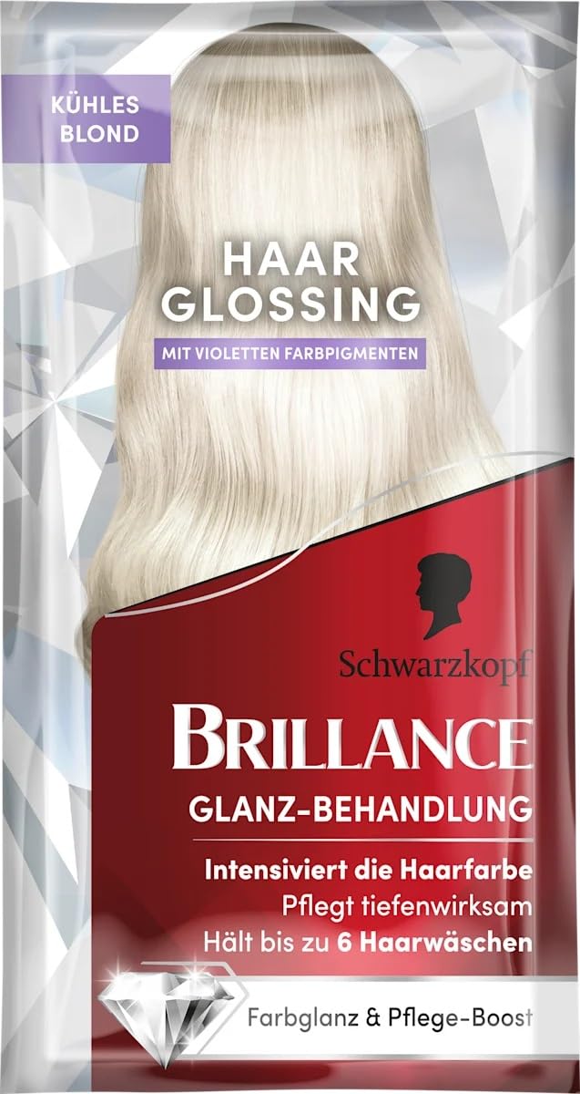 Schwarzkopf Brillance Glossing Anti-Yellowing Cool Blonde is ideal for enhancing your natural hair color and provides intense shine. The Boost treatment not only improves the feel of your hair but can also help reduce damage. Furthermore, this washable hair color lasts up to six washes. INGREDIENTS Ingredients: Aqua (Water), Cetearyl Alcohol, Behentrimonium Chloride, Phenoxyethanol, Isopropyl Myristate, Glyceryl Stearate, Stearamidopropyl Dimethylamine, Isopropyl Alcohol, Parfum (Fragrance), Citric Acid, Prunus armeniaca (Apricot) Oil, Polyquaternium-37 Macadamia Kernel Oil. Ternifolia Seed Oil, Cocos Nucifera (Coconut), Glycerin, Dicaprylyl Carbonate, Panthenol, Acid Violet 43, HC Blue No. 12, Citronellol, Limonene, Lauryl Glucoside, Benzyl Alcohol, HC Blue No. 16 SAFETY WARNING Please wear standard protective gloves. Apply as a normal hair mask to towel-dried hair. Leave on for 2 to 3 minutes, or longer for more intense color. Rinse hair thoroughly and style as usual. See moreVegan formula. With a conditioning boost. Adds shine. Lasts up to 6 washes. Hair color with an anti-yellowing formula.Brillance Traitement brillant de couleur - Blond froid - 30 mlDESCRIPTION DU PRODUIT DESCRIPTION DU PRODUIT Le Schwarzkopf Brillance Glossing anti-jaunissement blond froid est idéal pour affiner la couleur naturelle des cheveux et assure une brillance intense. Le soin Boost assure non seulement une meilleure sensation de cheveux, mais peut également aider à réduire les dommages aux cheveux. En outre, la coloration lavable dure jusqu'à six lavages. INGRÉDIENTS Ingrédients : aqua (eau, eau), alcool cétéarylique, chlorure de behentrimonium, phénoxyéthanol, myristate d'isopropyle, stéarate de glycéryle, stéaramidopropyl diméthylamine, alcool isopropylique, parfum (fragrance), acide citrique, prunus armeniaca (abricot), huile de noyau polyquaternium-37 Macadamia. Ternifolia Seed Oil, Cocos Nucifera (noix de coco), glycérine, carbonate de dicaprylyle, panthénol, acide violet 43, HC Blue No. 12, citronellol, limonène, lauryl glucoside, alcool benzylique, HC Blue No. 16 AVERTISSEMENT DE SÉCURITÉ Veuillez utiliser des gants de protection standard. Appliquer comme un masque capillaire normal sur cheveux séchés à la serviette. Laissez agir 2 à 3 minutes ou plus longtemps pour une couleur plus intense. Rincez soigneusement les cheveux et coiffez comme d'habitude. Voir plusFormule végétalienne. Avec boost de soin. Apporte plus de brillance. Dure jusqu'à 6 lavages. Coloration capillaire avec formule anti-jaunissement.