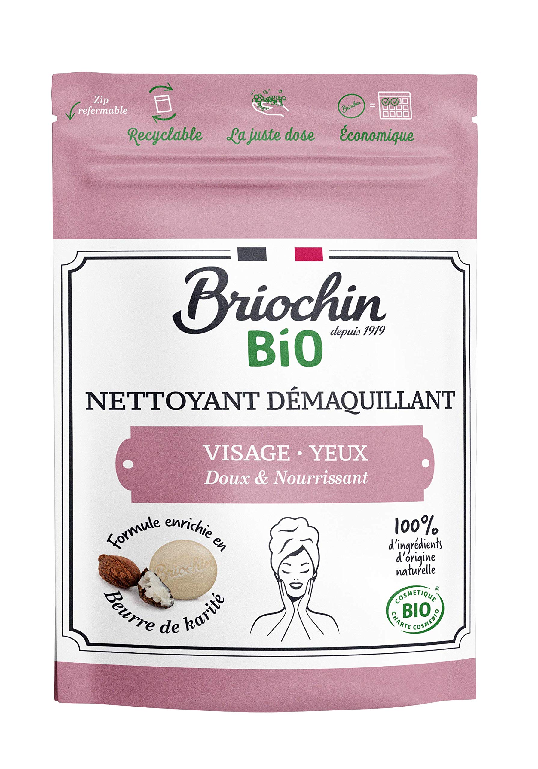 With its formula enriched with shea butter, our robust make-up remover removes make-up and at the same time maintains your skin.It can be used for both face and eyes.Bio-certified product thanks to its 100 natural formula.Reconcilable power bag.Made in France.Le Savoir -Faire de Droguiste à votre Service - Briochin Depuis 1919 is at your side and offers you a number of natural products made in France.We would like to share our know-how and our recipes to make everyday life easier by offering them traditional, natural, efficient and environmentally friendly products.Practical format, economic ecological!- Packed in a recyclable force bag, our solid shampoo can be applied with water in your hands or directly on the face.It can be easily transported and, thanks to the re -lockable zipper, it can be kept safely.The economical format in 50 g bread format corresponds to approx. 2 months.What are the advantages of our strong make-up removerWith shea butter-enriched formula it removes make-up and at the same time maintains your skin.It can be used for both face and eyes.Bio-certified product thanks to its 100 natural formula.Recyclable force bag.Made in France.Our robust make-up remover is a bio-certified Prroduct with the Cosmébio label.It consists of 100 natural ingredients.The Cosmébio label guarantees that products contain a formula of natural origin, but also respect for the environment, social obligations and responsible communication.Why should you choose a solid briochin make-up remover-Our robust make-up remover removes all kinds of make-up and ensures softness and moisture.Cleans with just one hand movement, donates moisture and, thanks to its 100 natural formula, makes it soft with shea butter, sunflower oil and carnauba axle.Mit seiner Formel angereichert mit Sheabutter entfernt unser robuster Make-up-Entferner Make-up und pflegt gleichzeitig Ihre Haut. Es kann sowohl für Gesicht als auch für Augen verwendet werden. Bio-zertifiziertes Produkt dank seiner 100 natürlichen Formel. Wiederverschließbarer Kraftbeutel. Hergestellt in Frankreich.Le Savoir-Faire de Droguiste à votre service - Briochin depuis 1919 ist an Ihrer Seite und bietet Ihnen eine Reihe von Naturprodukten, hergestellt in Frankreich. Wir möchten unser Know-how und unsere Rezepte teilen, um Ihnen den Alltag zu erleichtern, indem wir Ihnen traditionelle, natürliche, effiziente und umweltfreundliche Produkte anbieten. Praktisches Format, wirtschaftlich ökologisch! - In einem recycelbaren Kraftbeutel verpackt, kann unser festes Shampoo einfach mit Wasser in den Händen oder direkt auf das Gesicht aufgetragen werden. Es kann leicht transportiert werden und dank des wiederverschließbaren Reißverschlusses sicher aufbewahrt werden. Das sparsame Format im 50-g-Brotformat entspricht ca. 2 Monaten Nutzungsdauer. Was sind die Vorteile unseres starken Make-up-EntfernersMit Sheabutter angereicherter Formel entfernt es Make-up und pflegt gleichzeitig Ihre Haut. Es kann sowohl für Gesicht als auch für Augen verwendet werden. Bio-zertifiziertes Produkt dank seiner 100 natürlichen Formel. Recycelbarer Kraftbeutel. Hergestellt in Frankreich. Unser robuster Make-up-Entferner ist ein Bio-zertifiziertes Prrodukt mit dem Label Cosmébio. Es besteht aus 100 natürlichen Inhaltsstoffen. Das Label Cosmébio garantiert Ihnen, dass Produkte eine Formel natürlichen Ursprungs beinhalten, aber auch Respekt für die Umwelt, soziale Verpflichtungen und verantwortungsvolle Kommunikation. Warum sollten Sie sich für einen soliden Briochin Make-up-Entferner entscheiden- Unser robuster Make-up-Entferner entfernt alle Arten von Make-up und sorgt für Weichheit und Feuchtigkeit. Mit nur einer Handbewegung reinigt, spendet Feuchtigkeit und macht sie weich dank seiner 100 natürlichen Formel mit Sheabutter, Sonnenblumenöl und Carnaubawachs.Briochin depuis 1919 - Robuster Make-up-Entferner, 50 g, für Gesicht und Augen, weich und pflegend, wiederverschließbarer Kraftbeutel