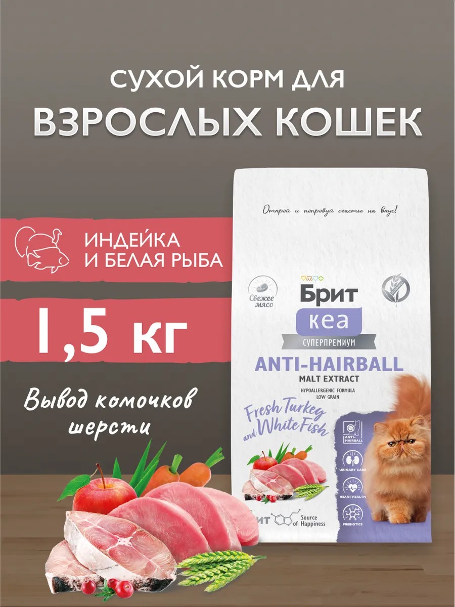 Полнорационный сухой корм суперпремиум-класса с белой рыбой и индейкой для взрослых кошек. Вывод шерсти.
