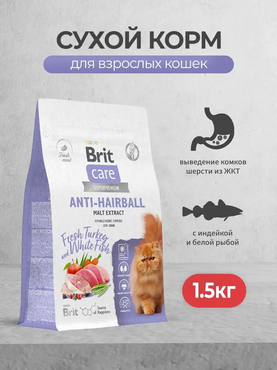 Brit Care dry food with white fish and turkey for adult cats is specially designed to prevent hairballs. The Anti-Hairball formula helps remove ingested hair from the cat's stomach, which is especially important for long-haired breeds and cats prone to shedding.