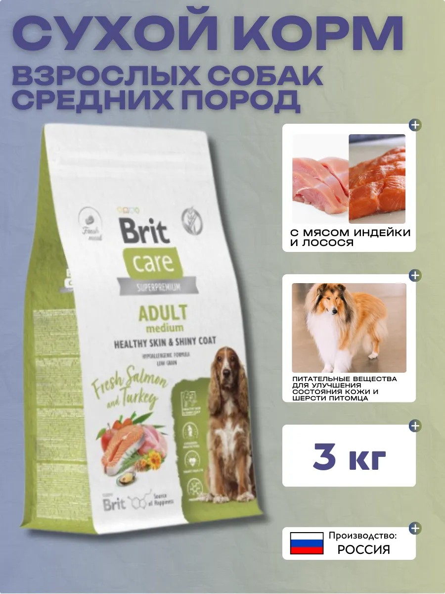 Super-premium complete dry food with salmon and turkey for adult medium-sized dogs. Promotes healthy skin and coat. Nutrient deficiencies can negatively impact the condition of your pet's skin and coat. Shelf life: 18 months from the date of manufacture. Product is packaged in polymer bags that comply with technical regulations. Storage conditions: Store at temperatures from 0 to 25°C and a relative humidity of no more than 75%. Protect from sunlight.