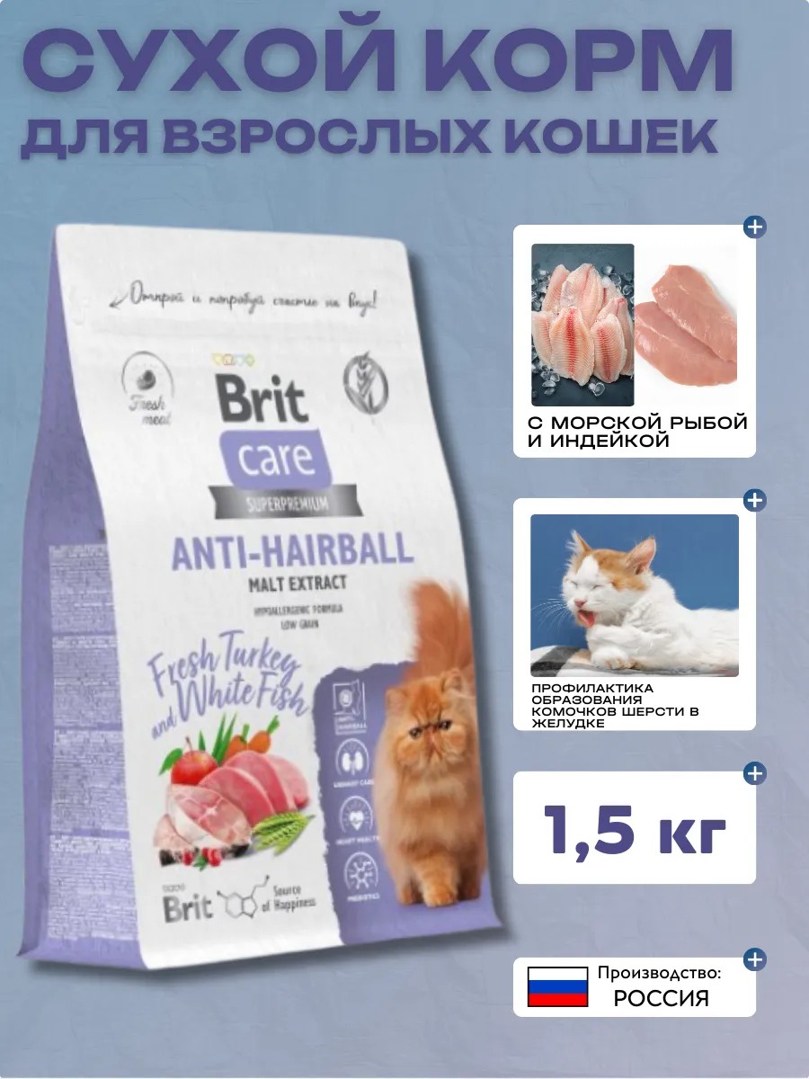 Brit Care Корм сухой Hairball для кошек с белой рыбой 1,5 кг