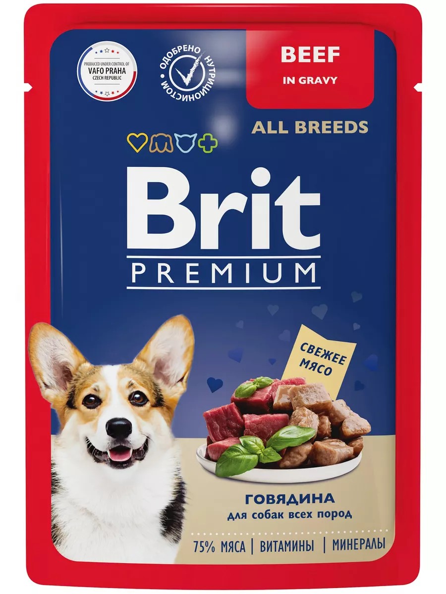 Корм Brit Premium All Breeds Beef (в соусе) для собак, с говядиной, 85 г x 14 шт. Корм Brit Premium All Breeds Beef (в соусе) для собак, с говядиной Полнорационный влажный корм премиум класса с говядиной в соусе для взрослых собак всех пород. Нежные кусочки мяса в ароматном соусе - идеальное сочетание для полноценного и сбалансированного рациона. Паучи Brit Premium однозначно заинтересуют вашу собаку и станут для нее любимым блюдом. Влажный корм премиального качества содержит 75 % свежего мяса и все необходимые витамины и минералы для ежедневного рациона. Паучи отлично дополнят полнорационный сухой корм Brit Premium и внесут разнообразие в питание Вашего питомца. Состав: 75% мясо и мясные субпродукты (в том числе говядина 10%), мука рисовая, мука пшеничная, клетчатка свекловичная, рыбий жир, минерально-витаминный комплекс, загуститель. Пищевая ценность на 100 г (средние значения) : сырой протеин 9,6 г, сырой жир 5,4 г, сырая зола 3 г, сырая клетчатка 0,1 г, влага 82 %, Омега-6 0,85 г, Омега-3 0,11 г, кальций 0,4 г, фосфор 0,3 г. Питательные добавки на 1 кг: витамин А 1400 МЕ, витамин D3 250 МЕ, витамин Е 100 мг, цинк 10 мг, марганец 2 мг, йод 0,7 мг, медь 0,2 мг, биотин 0,1 мг. Энергетическая ценность на 100 г: 98 ккал / 410 кДж. Масса НЕТТО: 85 г.