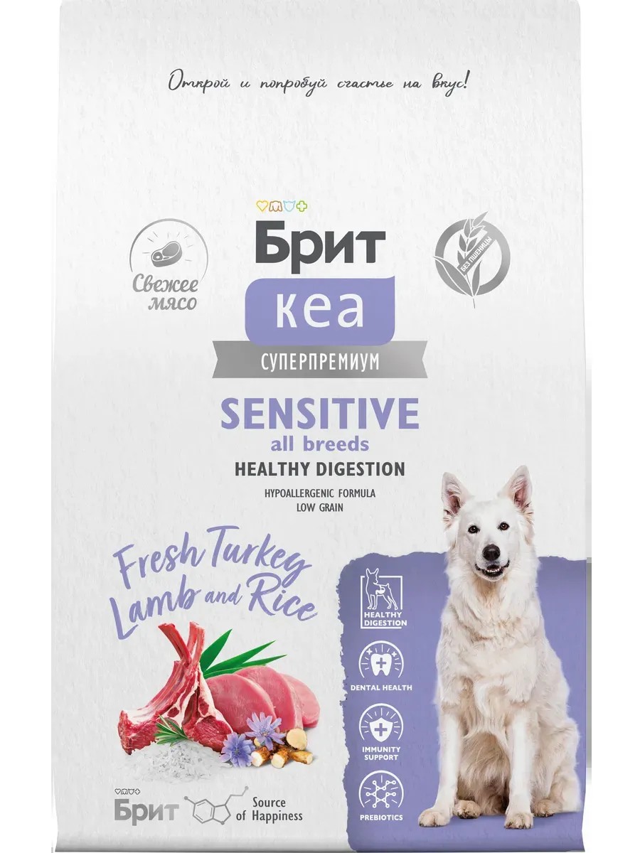 Brit Care Superpremium Sensitive Healthy Digestion (low grain) for dogs with sensitive digestion, with turkey, lamb, and rice, 3 kg. Complete super-premium dry food with turkey, lamb, and rice for adult dogs of all breeds. Sensitive digestion. Digestive health. Healthy teeth and gums. Immune system support. Gut flora support. Dogs living in cities are exposed to stress, which negatively impacts their digestion. It is important to maintain beneficial gut flora. Turkey is a natural source of L-tryptophan, the hormone of happiness Lamb meat, rice and optimal fat content for healthy and active digestion Fatty acids from natural sources for beautiful coat and healthy skin Fresh meat for activity throughout the day Vitamins, minerals and antioxidants to support the pet's immunity Soluble and insoluble dietary fiber for healthy digestion and intestinal microflora Ingredients: Meat 41% (dehydrated turkey meat 31%, fresh turkey meat and by-products 5%, fresh lamb meat 5%), barley, whole grain rice, yellow peas, animal fat 5% (source of Omega-6 fatty acids), oats, hydrolyzed animal protein 3%, vitamin and mineral complex, brewer's yeast (source of mannan-oligosaccharides), beet fiber, chicory root, fish oil (source Omega-3 fatty acids), dried apple (source of soluble prebiotic fiber), choline chloride, dried potato, dried carrot, DL-methionine, yucca schidigera, New Zealand mussel, flaxseed, rosemary, tomato, chondroitin, glucosamine, antioxidant (including rosemary extract, natural tocopherols). Nutritional content per 1 kg: protein 29%, fat 12%, moisture 8%, fiber 3.5%, ash 7.5%, calcium 1.8%, phosphorus 1.2%. Analytical composition: protein 29 g, fat 12 g, ash 7.5 g, fiber 3.5 g, moisture 8 g, calcium 1.8 g, phosphorus 1.2 g. Energy value per kg: 3640 kcal / 15230 kJ