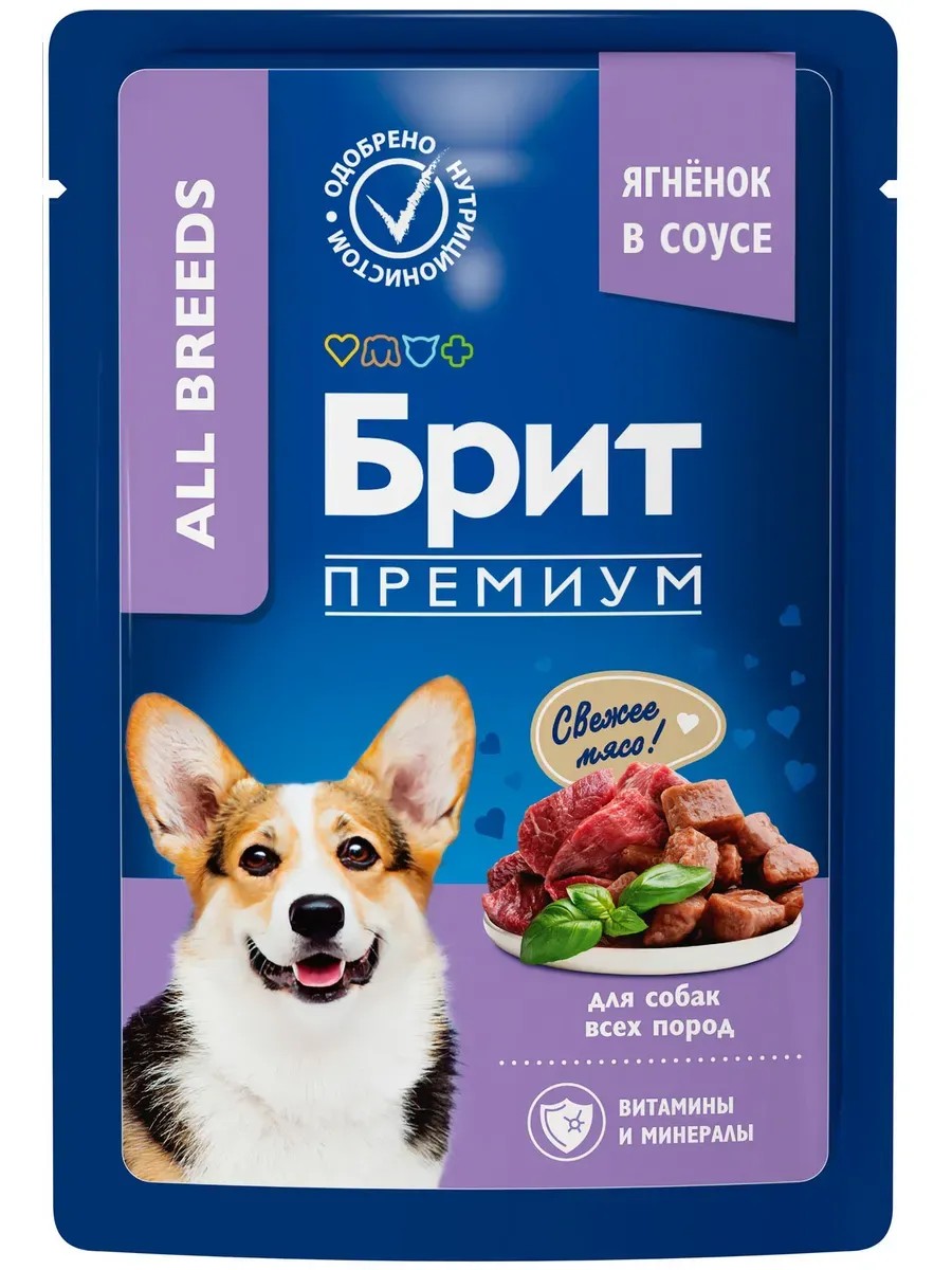 Корм Brit Premium All Breeds Lamb (в соусе) для собак, с ягненком, 85 г 14 шт. Корм Brit Premium All Breeds Lamb (в соусе) для собак, с ягненком, 85 г x 14 шт. Корм Brit Premium All Breeds Lamb (в соусе) для собак, с ягненкомПолнорационный влажный корм премиум класса с ягненком в соусе для взрослых собак всех пород. Нежные кусочки мяса в ароматном соусе - идеальное сочетание для полноценного и сбалансированного рациона. Паучи Brit Premium однозначно заинтересуют вашу собаку и станут для нее любимым блюдом. Влажный корм премиального качества содержит 75 % свежего мяса и все необходимые витамины и минералы для ежедневного рациона. Паучи отлично дополнят полнорационный сухой корм Brit Premium и внесут разнообразие в питание Вашего питомца.Состав: 75% мясо и мясные субпродукты (в том числе ягненок 10%), мука рисовая, мука пшеничная, клетчатка свекловичная, рыбий жир, минерально-витаминный комплекс, загуститель.Пищевая ценность на 100 г (средние значения): сырой протеин 9,6 г, сырой жир 5,4 г, сырая зола 3 г, сырая клетчатка 0,1 г, влага 82 %, Омега-6 0,85 г, Омега-3 0,11 г, кальций 0,4 г, фосфор 0,3 г.Питательные добавки на 1 кг: витамин А 1400 МЕ, витамин D3 250 МЕ, витамин Е 100 мг, цинк 10 мг, марганец 2 мг, йод 0,7 мг, медь 0,2 мг, биотин 0,1 мг.Энергетическая ценность на 100 г: 98 ккал / 410 кДжУсловия хранения: хранить при температуре от 0 С до 25 С и относительной влажности воздуха не более 75 %. После вскрытия потребительской упаковки продукт хранить в холодильнике не более 2 суток. Перед подачей рекомендуется довести продукт до комнатной температуры.Масса НЕТТО: 85 г.