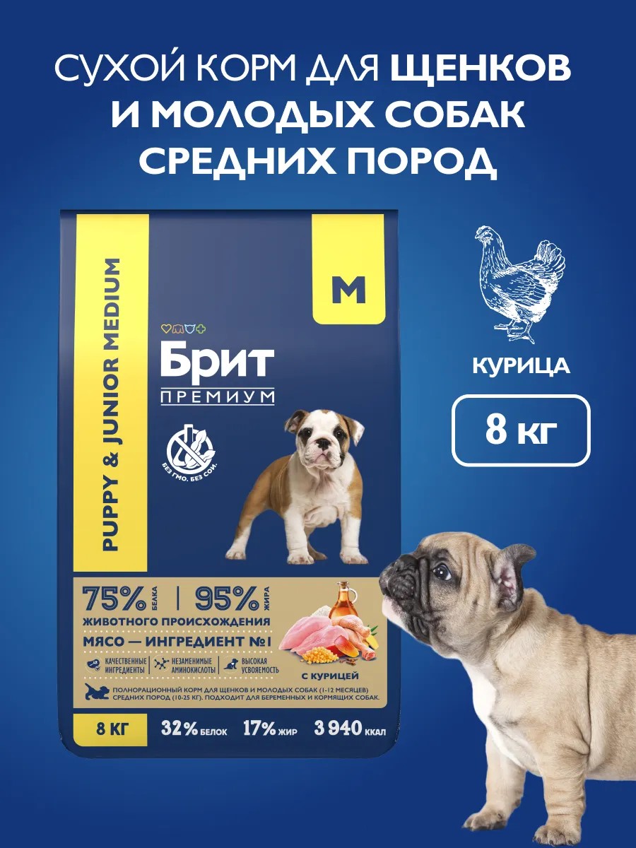 Полнорационный сухой корм Brit Premium Junior Medium с курицей для молодых собак (1-12 месяцев) средних пород (10-25 кг). Подходит для беременных и кормящих собак.