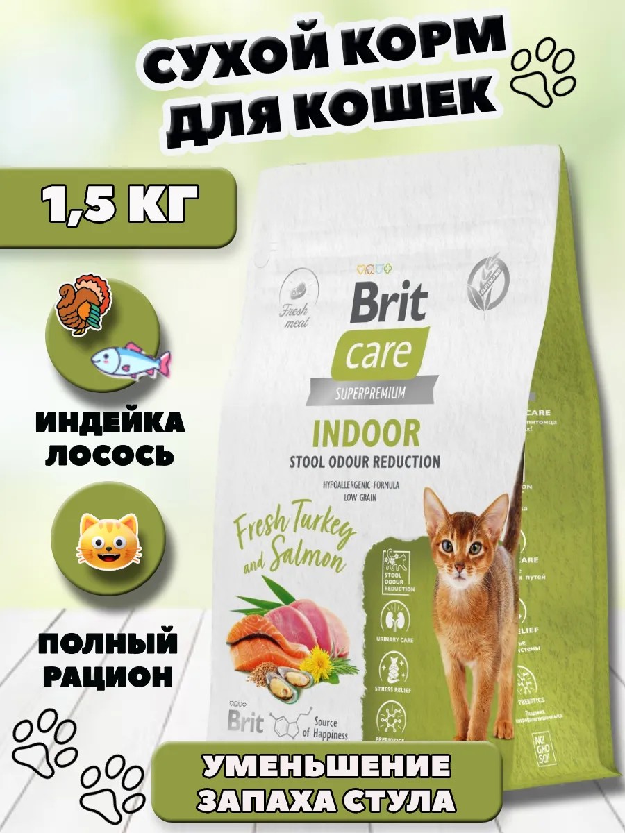 Brit Сухой корм для кошек Indoor Stool индейка и лосось 1,5 кг