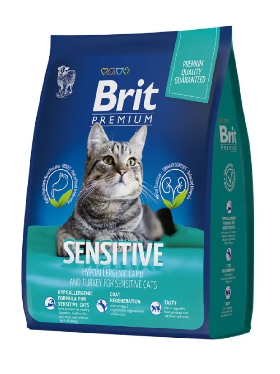 Brit Premium Sensitive. Полнорационный сухой корм премиум класса с индейкой и ягненком для взрослых кошек с чувствительным пищеварением.Сухой корм Brit Premium с индейкой и ягненком предназначен для взрослых кошек с чувствительным пищеварением. Сбалансированный состав содержит все витамины и минералы, необходимые для ежедневного здорового питания вашего питомца. Корм поможет сохранить здоровье и активность вашего питомца, а мясо в составе обеспечивает притягательный аромат и вкус, который не оставит равнодушным даже самых привередливых питомцев.Состав: дегидрированное мясо 36 % (индейка, ягненок), маис цельнозерновой, жир куриный (источник Омега-6 жирных кислот), рис, маисовый протеин, свекольная пульпа, соус из гидролизированного мяса ягнёнка 2 %, дрожжи (источник маннанолигосахаридов), витаминно-минеральный комплекс, дегидратированная печень, рыбий жир (источник Омега-3 жирных кислот), таурин, топинамбур (источник фруктоолигосахаридов), клюква, антиокислитель, экстракт юкки Шидигера, экстракт розмарина.Пищевая ценность на 100 г (средние значения): белок 32 г, жир 16 г, клетчатка 1,2 г, зола 7,8 г.Витамины, минералы, аминокислоты на 1 кг: Условия хранения: хранить при температуре от -5 °с до +35 °с, относительной влажности воздуха не более 80 %. беречь от попадания прямых солнечных лучей. плотно закрывать упаковку после вскрытия.Рекомендации по кормлению: корм следует давать сухим или увлажненным теплой водой. у животного всегда должен быть доступ к миске со свежей водой.Важно: при вводе нового корма смешайте его небольшое количество с привычной едой и в течение нескольких дней постепенно увеличивайте количество нового корма. следуйте рекомендациям по ежедневному питанию, представленным в таблице. количество корма может меняться в зависимости от таких факторов, как возраст и уровень активности.Обратите внимание, что размер гранул может отличаться от заявленного на 0,1 – 0,3 см. Это производственный момент и на качество корма не влияет.