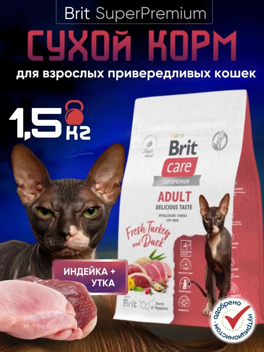 Полнорационный сухой корм Брит Кэа суперпремиум класса из индейки и утки для взрослых кошек, привередливых ко вкусу корма.